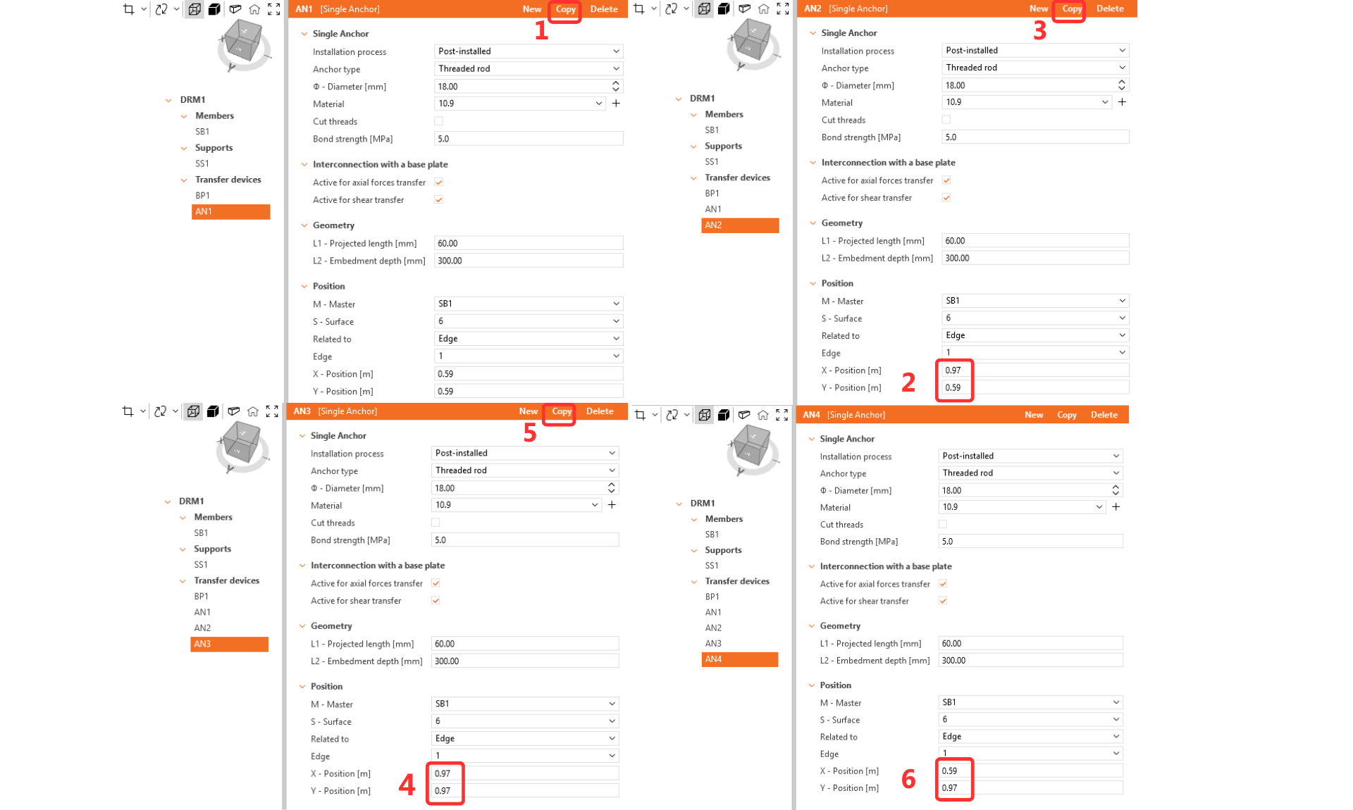 Je důležité propojit kotvu s patní deskou, protože na ni bude aplikováno zatížení. Zkopírujte kotvu třikrát a upravte její umístění.