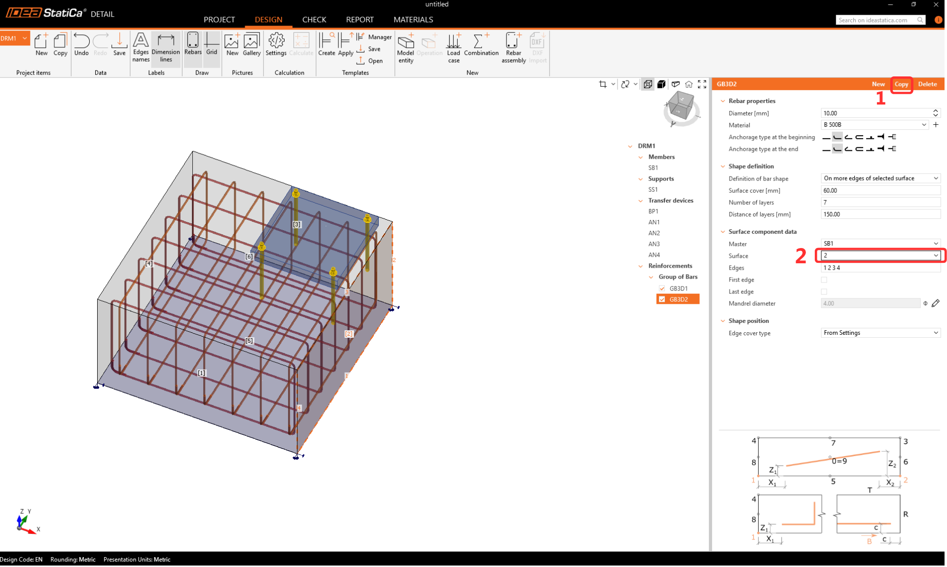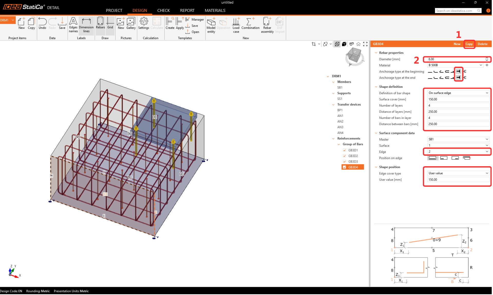 Zkopírujte skupinu vložek znovu a upravte parametry pro definování vodorovné výztuže.