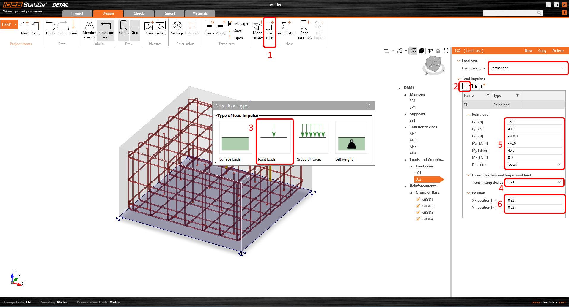 V dalším kroku se definují návrhové hodnoty stálého zatížení působícího na patní desku. Můžete definovat šest složek bodového zatížení a jeho polohu na patní desce.