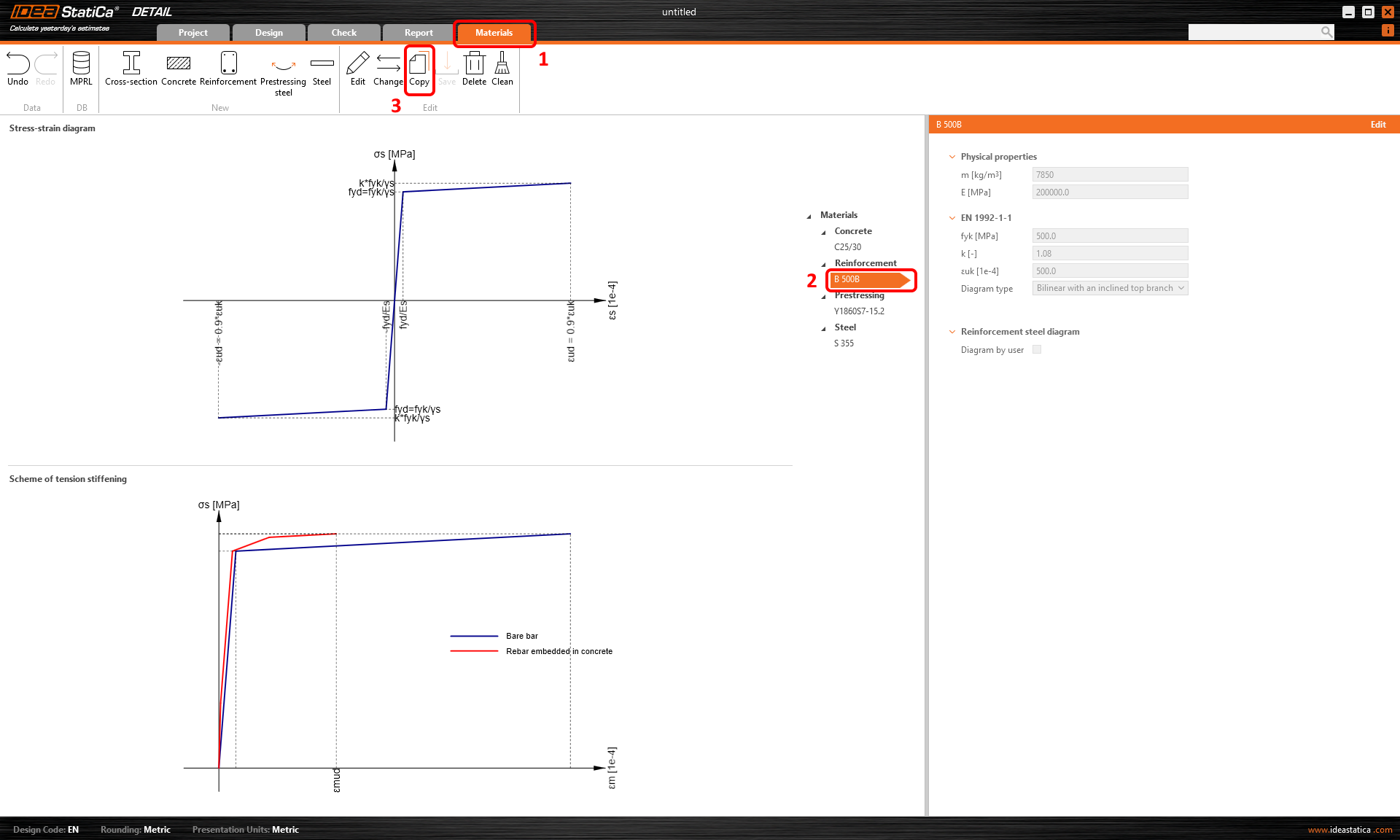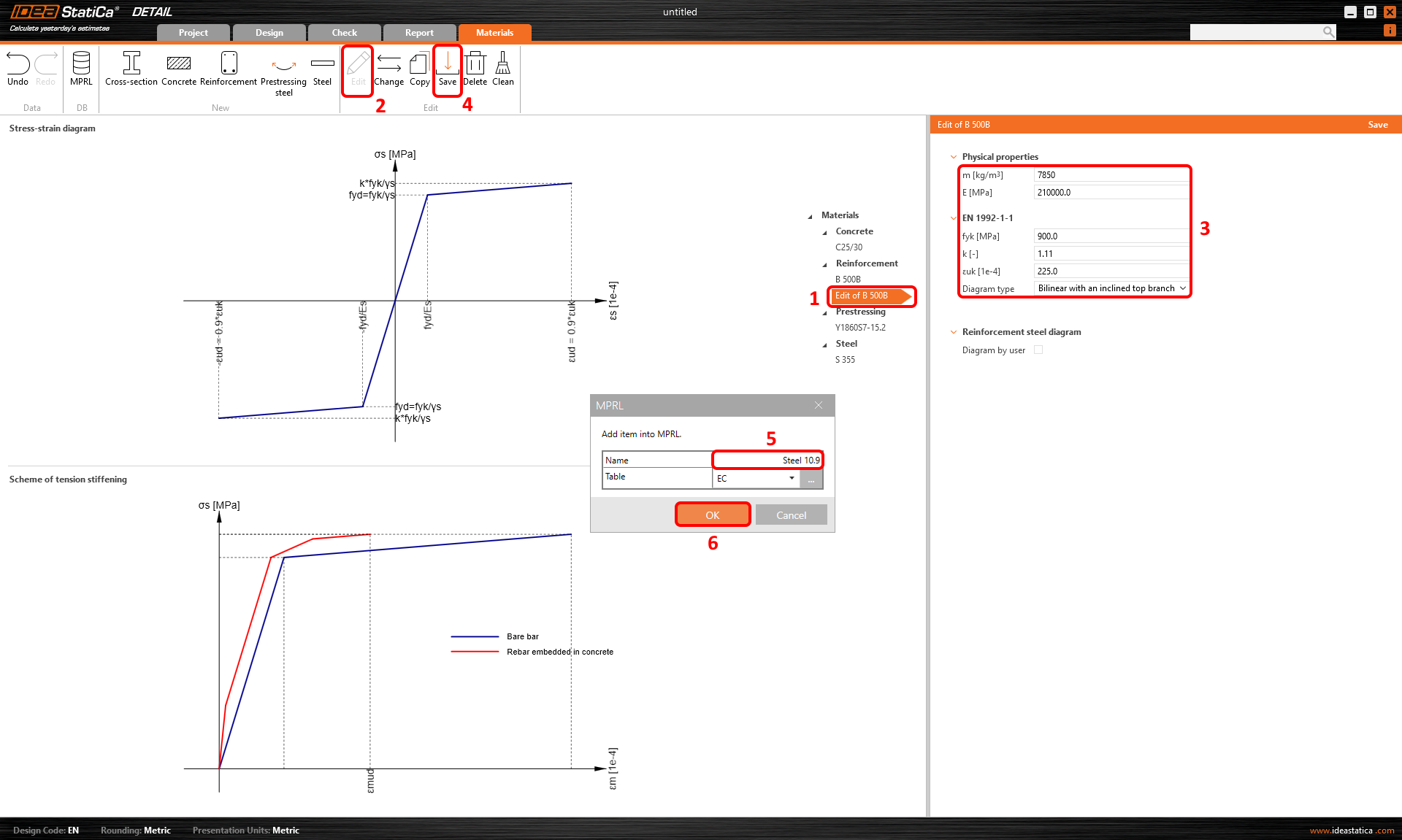 Po úspěšném definování patní desky je nyní čas přejít ke kotvám. Kotvy musí být vyrobeny z oceli třídy 10.9. To znamená, že musíte definovat nový materiál, protože v současné době je ve výchozím nastavení k dispozici pouze ocel pro betonářskou výztuž. Přepněte se na záložku Materiály a zkopírujte existující výztuž B500B.