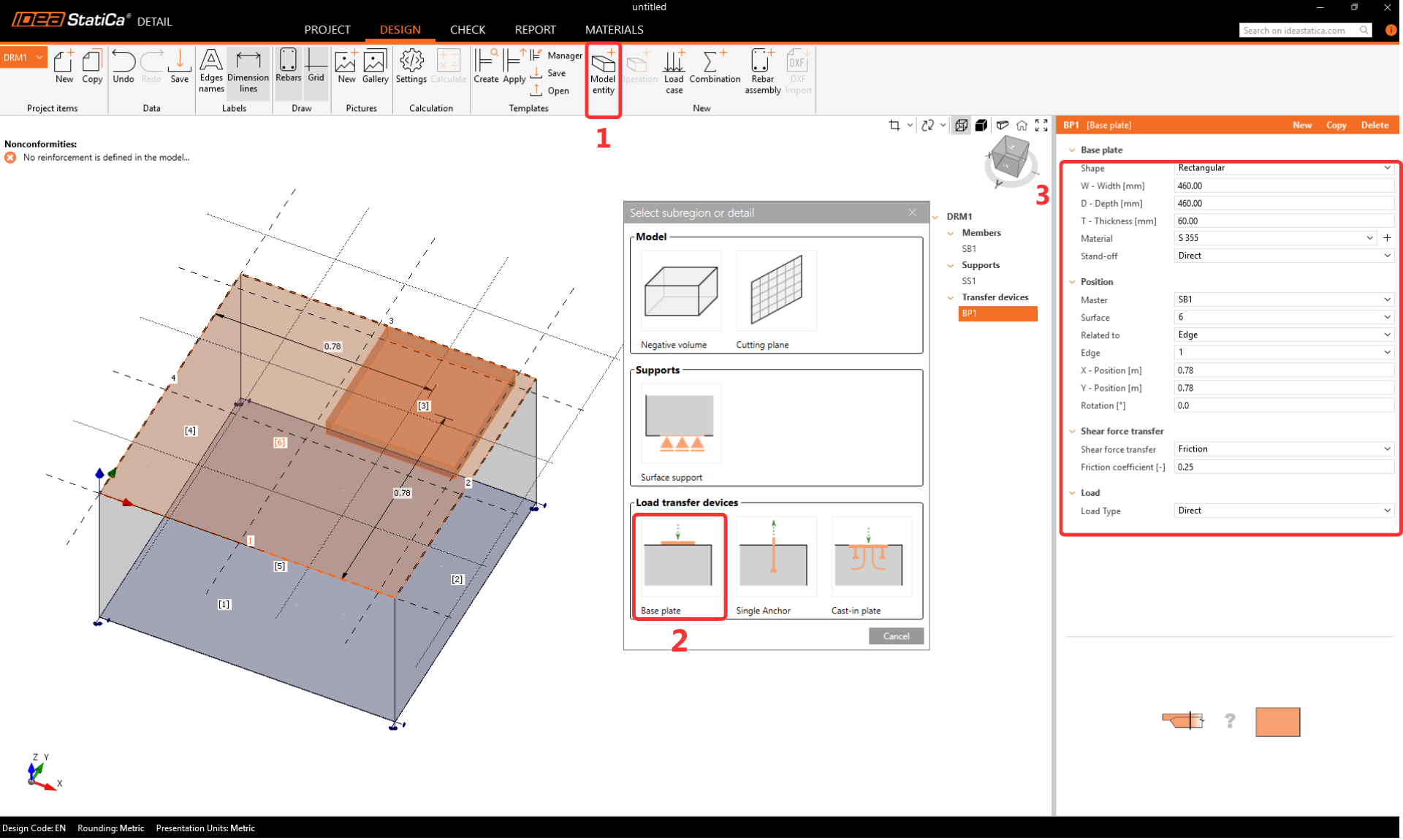 Dalším krokem je definování Prvků pro přenos zatížení. Jako první bude vytvořena patní deska. Definujte čtvercovou ocelovou patní desku umístěnou poblíž okraje betonového bloku. Smyková síla se přenáší třením mezi ocelovou deskou a betonovým povrchem. Alternativně lze přenos smyku přiřadit smykové zarážce nebo kotvám.