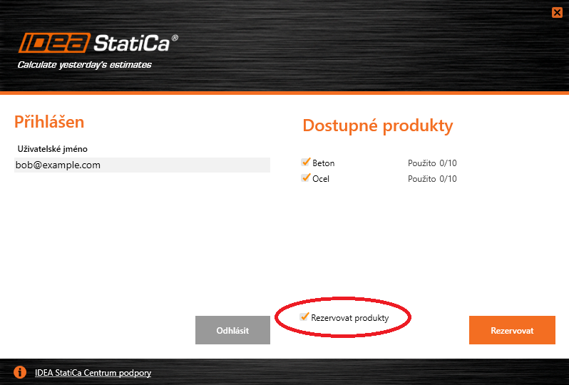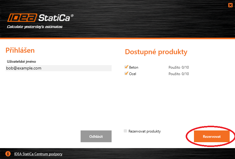 Zde můžete vidět své uživatelské jméno a seznam dostupných produktů (zobrazují se pouze zakoupené produkty). Vyberte produkty, které chcete používat pomocí zaškrtnutí/odškrtnutí a stiskněte tlačítko Rezervovat.