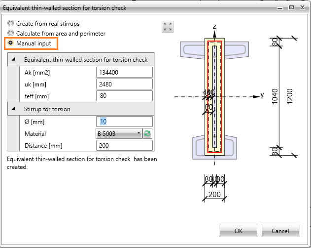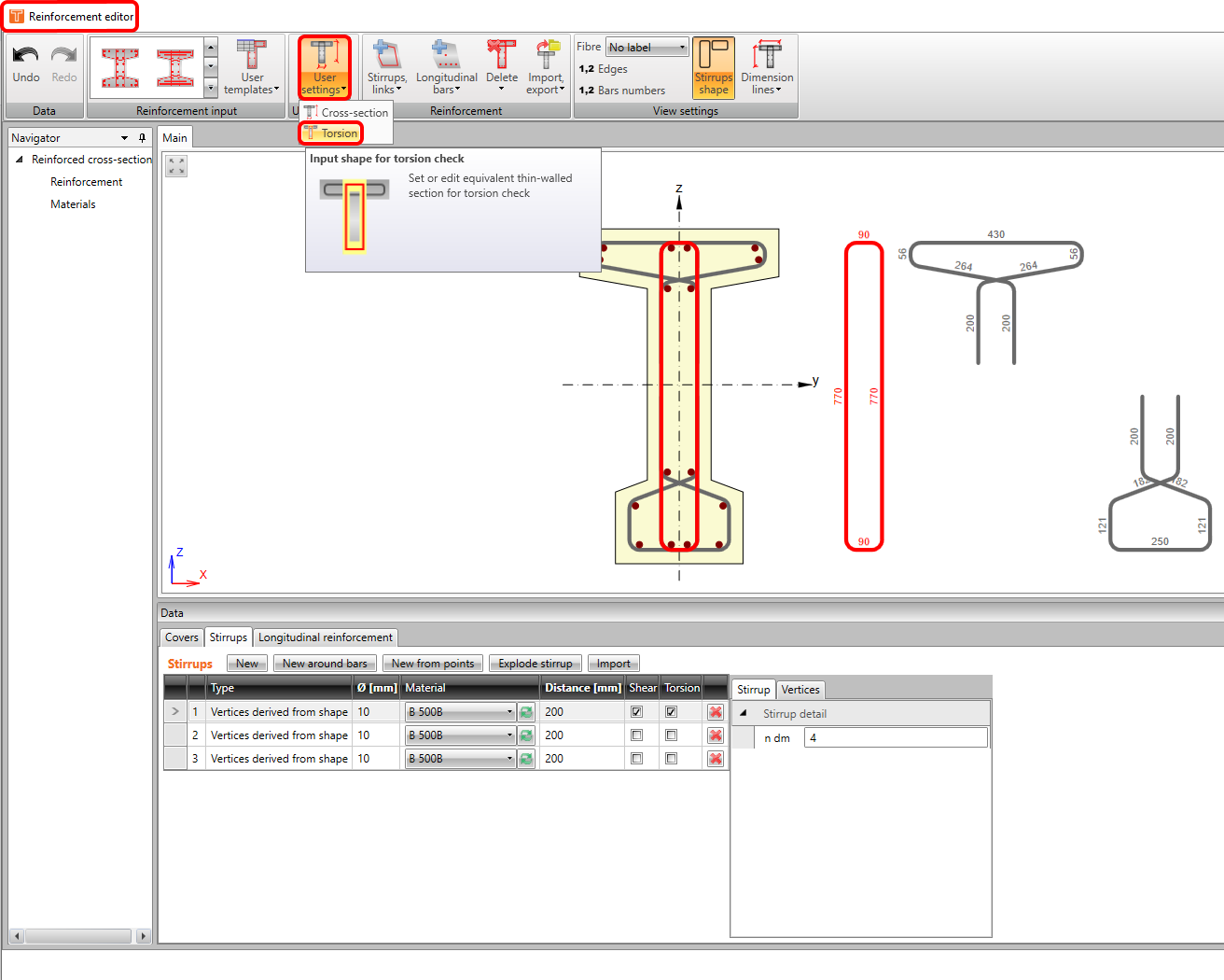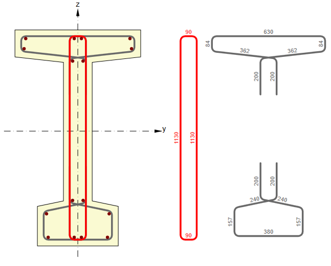 I když je v programu IDEA StatiCa možné vyztužit průřez kvůli vyztužovacím výkresům a výkazu materiálu zcela detailně, některé vložky smykové výztuže (zejména ty otevřené) nemusí být účinné na kroucení nebo smyk. Zohlednění účinnosti na smyk nebo kroucení se řídí zaškrtávacím tlačítkem v pravé části v seznamu smykové výztuže. Nastavení si ukážeme na příkladu železobetonového I průřezu.