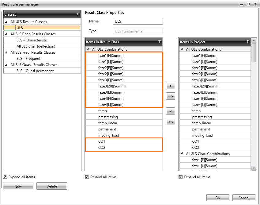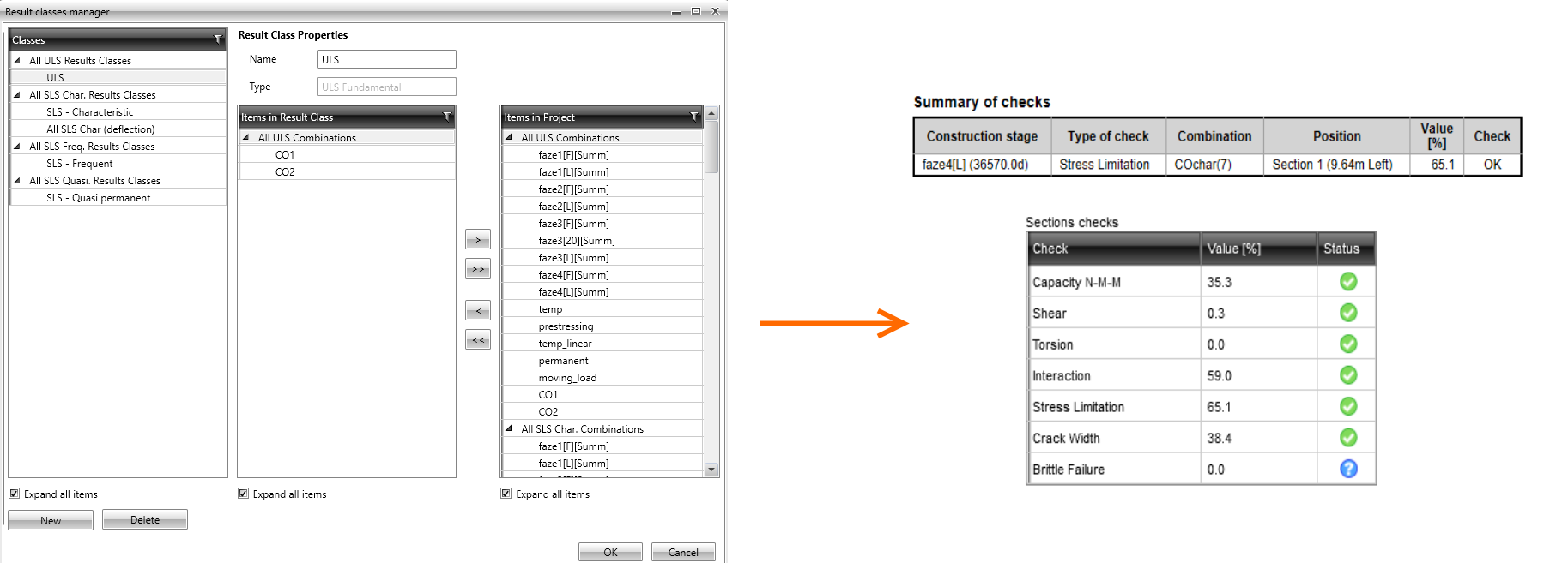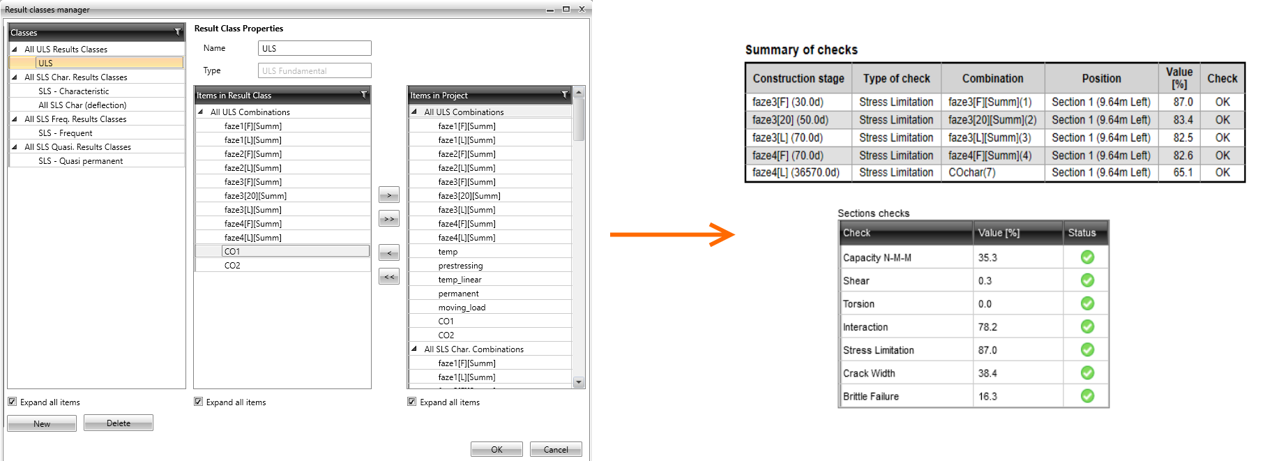 V projektu se obvykle vygeneruje spousta kombinací pro pokrytí všech možností. Některé z těchto kombinací ale slouží jenom jako podkombinace výsledným kombinacím anebo je prostě nechceme posoudit u ladění konstrukce. Třída výsledků nám definuje, které kombinace se vezmou v úvahu do posudků a ty jsou seřazeny v seznamu.