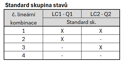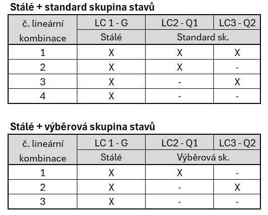 Veličiny ze Stálých zatěžovacích stavů jsou do lineární kombinace zahrnuty vždy, takže jsou přítomny v každé z lineárních kombinací.