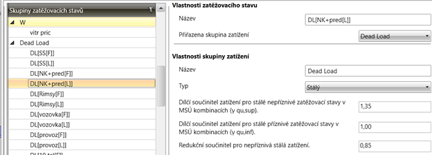 Např. stálá zatížení pak jsou obsažena jen v jednom stavu Dead load, který tak reprezentuje kumulovaná stálá zatížení ze všech fází na konci výstavby – poslední fázi. Naopak po importu do apliakci BIM se kumulativní stav Dead load rozpadne do dílčích přírůstkových stavů podle fází výstavby – vždy jeden pro začátek a jeden pro konec fáze. Toto se děje proto, aby byla apliakce BIM schopna „zreplikovat“ fázovaný výpočet konstrukce a např. správně nastavit postup předpínání a výchozí stav průřezu pro posudek v RCS. Jednotlivé přírůstkové stavy jsou v BIM pojmenovány DL<název fáze>[F] pro začátek fáze a DL<název fáze>[L] pro konec. A všechny tyto stavy jsou zařazeny do skupiny zatěžovacích stavů pojmenované Dead load, viz následující obrázek.
