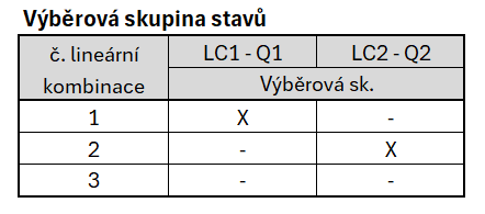 Pro zatěžovací stavy ze skupiny typu Výběrová platí, že v jednotlivých lineárních kombinacích se použije vždy jen jeden zatěžovací stav ze skupiny.