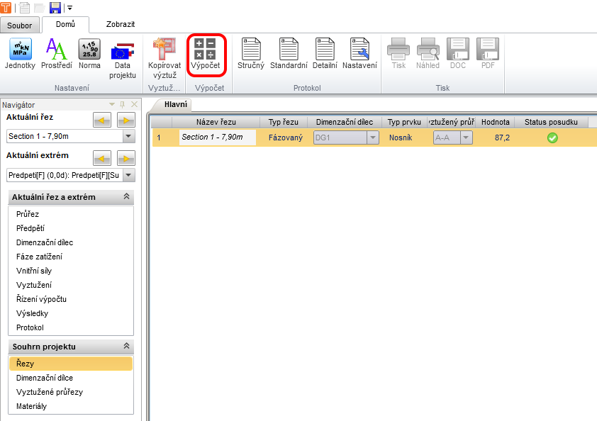 Po exportu se otevře RCS v záložce Řezy, kde spusťte propočty tlačítkem Vše.