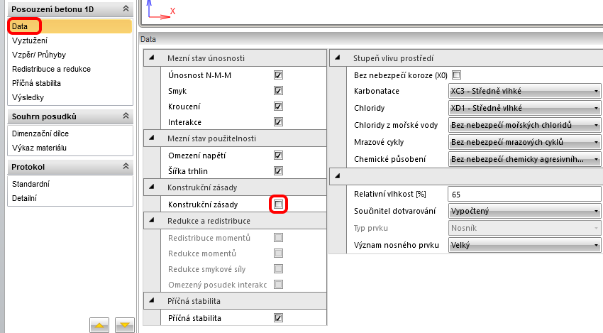 Pokračujte k části posouzení nosníku. Začňěte záložkou Data, kde nastavíte požadované typy posudků a stupeň vlivu prostředí. Dále deaktivujte posouzení konstrukčních zásad, jelikož jste kabely modelovaly průměrným kabelem pro každou vrstvu a program by hlásil jejich nedostatečnou vzdálenost od sebe.