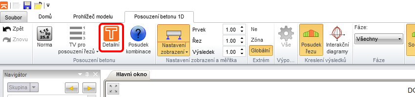 V pravé části obrazovky vidíte souhrnou tabulku extrémních hodnot všech posudků, všechny vyhovují. Na horní liště si snadno vyberte posudek, který chcete vykreslit po délce nosníku. Pro zobrazení detailních výsledků můžete exportovat všechny řezy do modulu RCS tlačítkem Detailní.
