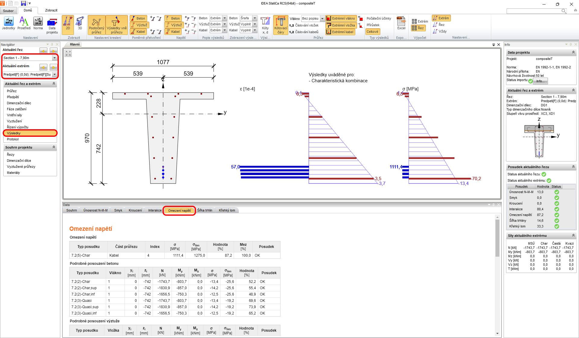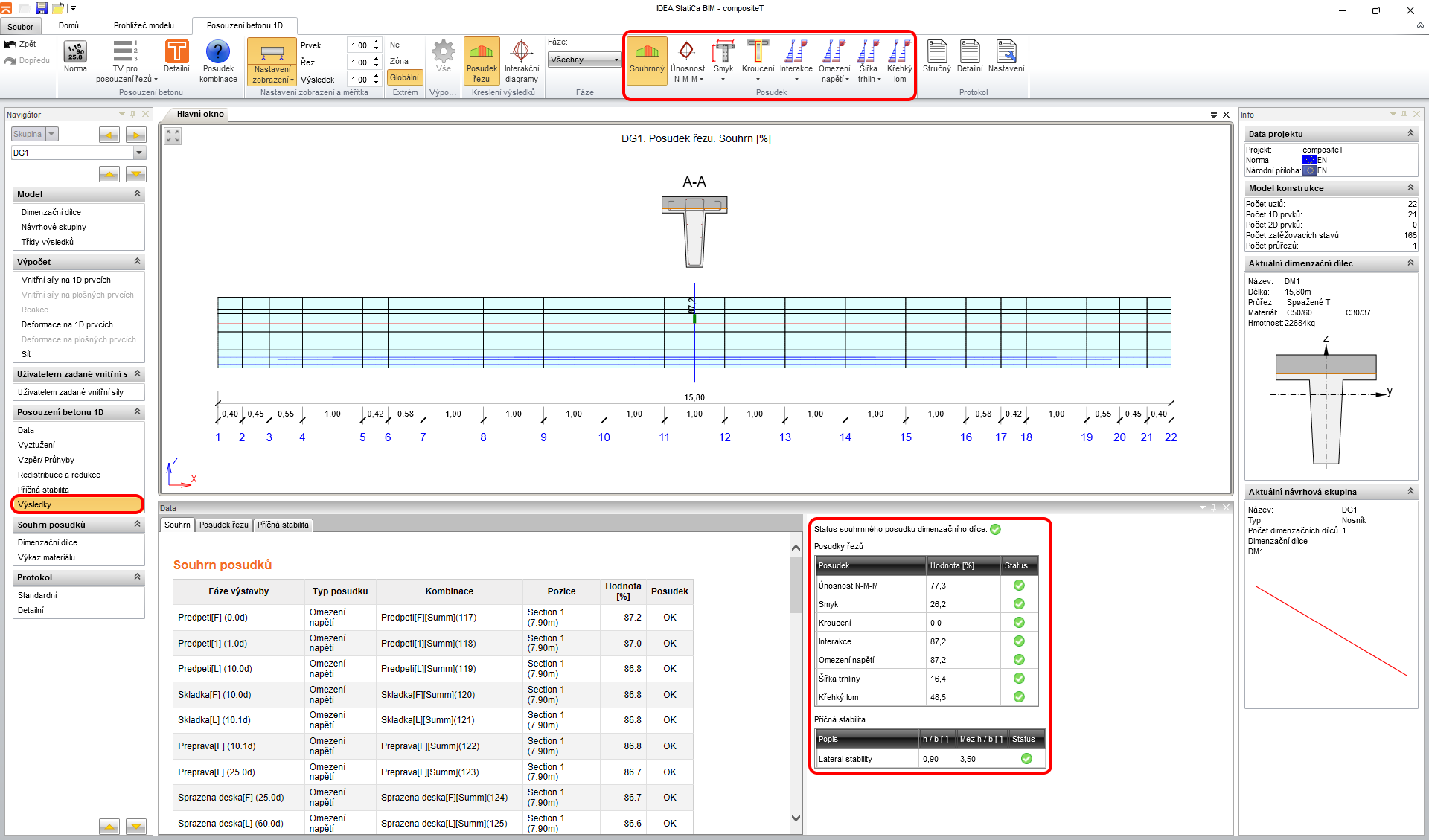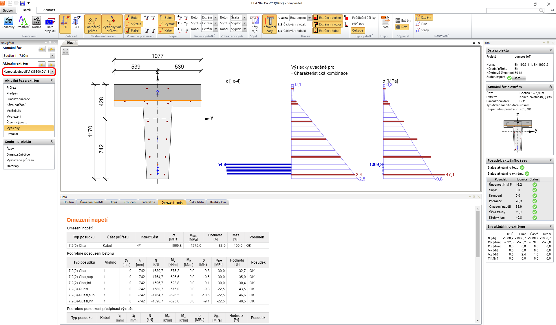 Když přepnete na záložku Výsledky můžete přepínat mezi posudky a sledovat mezivýsledky a vstupní/výstupní hodnoty. Nalevo v navigátoru se nachází také přepínač řezů a extrémů, pro které výsledky zobrazujete. Na dalším obrázku zobrazujte fázi předpínání, tedy spřažená deska ještě neexistuje.