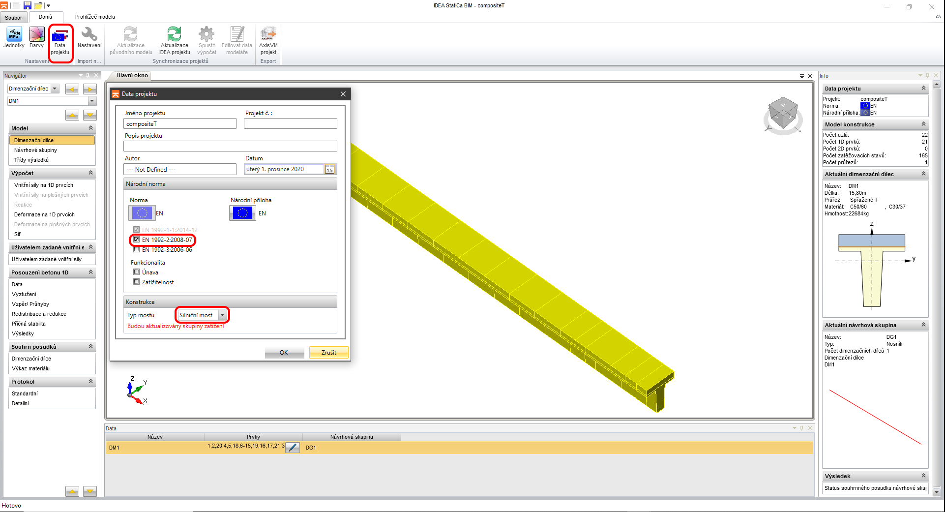 Ve vašem případě byly přepsány některé materiálové charakteristiky. Předtím než navrhnete nosník, proveďte několik nastavení. V záložce Data projektu vyberte normu 1992-2:2008-07 a typ mostu Silniční.