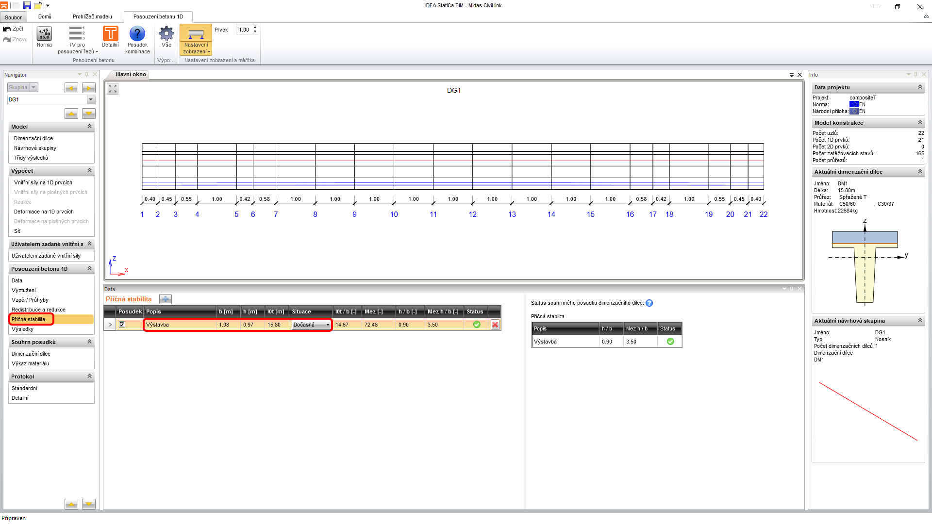 Nakonec nastavte posudek příčné stability během výstavby nosníku. Přepněte se na záložku Příčná stabilita a zadejte šířku tlačené pásnice 1,077m, výšku nosníku bez desky 0,97m a vzdálenost torzních vazeb 15,8m. Přenastavte Situaci na Dočasnou a zkontrolujte hodnotu posudku.