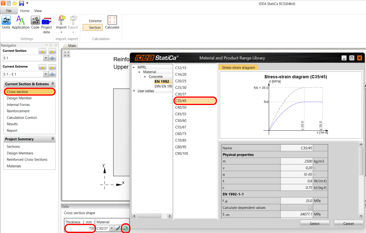Návrh vyžaduje použití deskového elementu 1 x 1 m o Tloušťce 700 mm a betonu třídy C35/45. Jedná se o jednoduché zadání geometrie a vlastností materiálu.