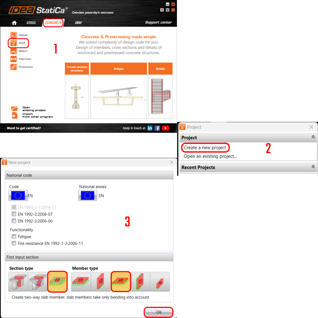 Spustíme IDEA StatiCa, přejdeme na záložku Beton a vybereme aplikaci RCS. Vytvořte nový projekt kliknutím na Vytvořit nový projekt. V dalším dialogu ponechte výchozí obecné nastavení Eurokódu a vyberte 2D řez a typ dílce deska.