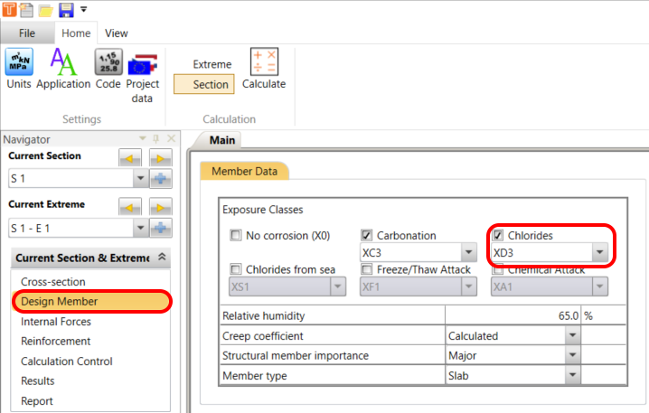 Třída prostředí průřezu určuje jeho vyhodnocení na maximální šířku trhlin a konstrukčních zásad. Změňte třídu Chloridy na XD3.