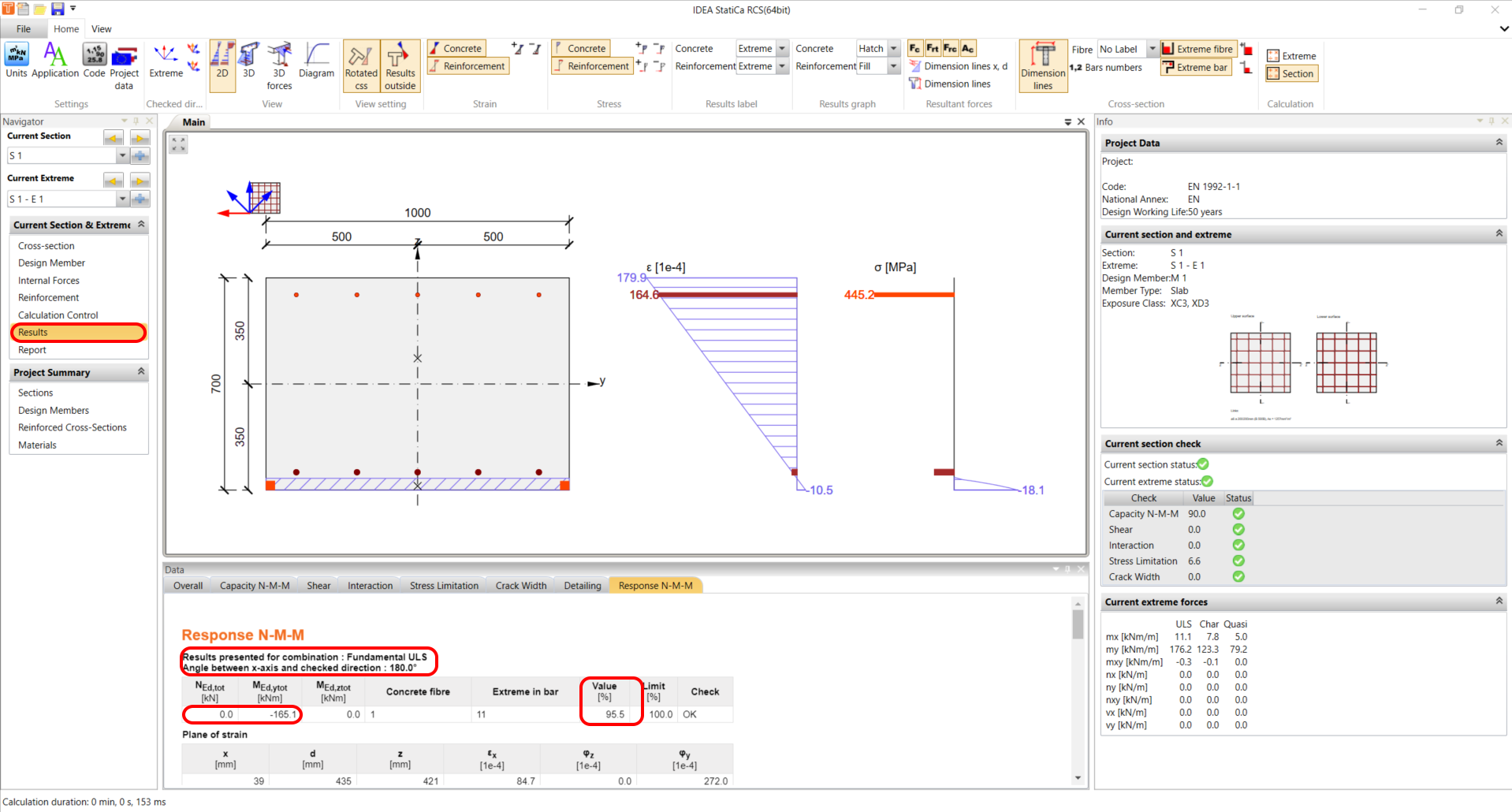 - Pokud jsou pruty výztuže na sebe kolmé, jsou výsledky posudku podobné pro různé úhly směru kontroly, nejsou závislé na definovaném úhlu výztuže a maximální hodnota posudku je nalezena pro úhly 0, 45 a 90 stupňů. Tento posudek lze tedy provést pro předem definovaný směr kontrolního úhlu 0 stupňů.