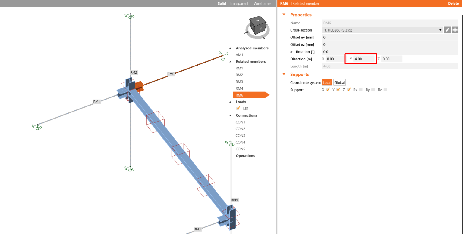 Přejděte na nově vytvořený Připojený prvek RM6 a změňte směr y na 4 m.