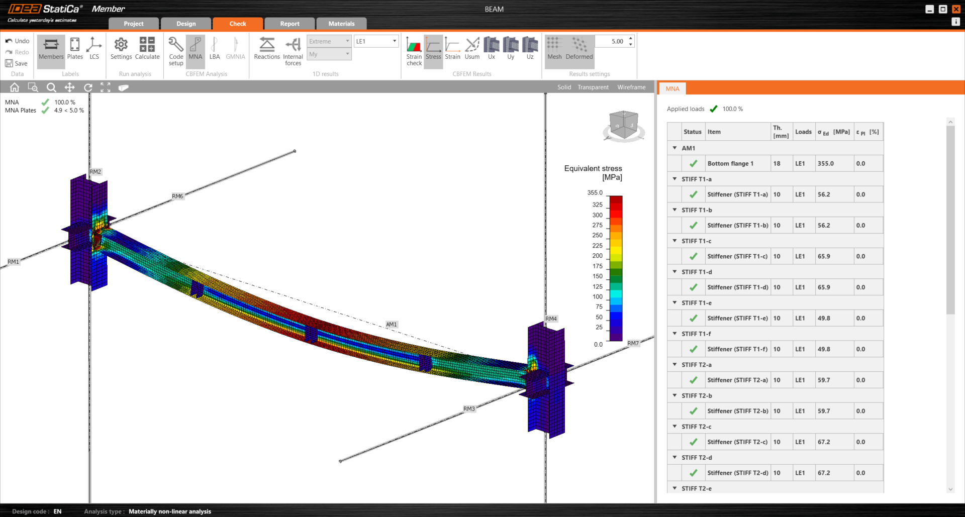 Jak vidíte ve výsledku, velikost nosníku je dostatečná i pro výpočet s geometrickou nelinearitou.
