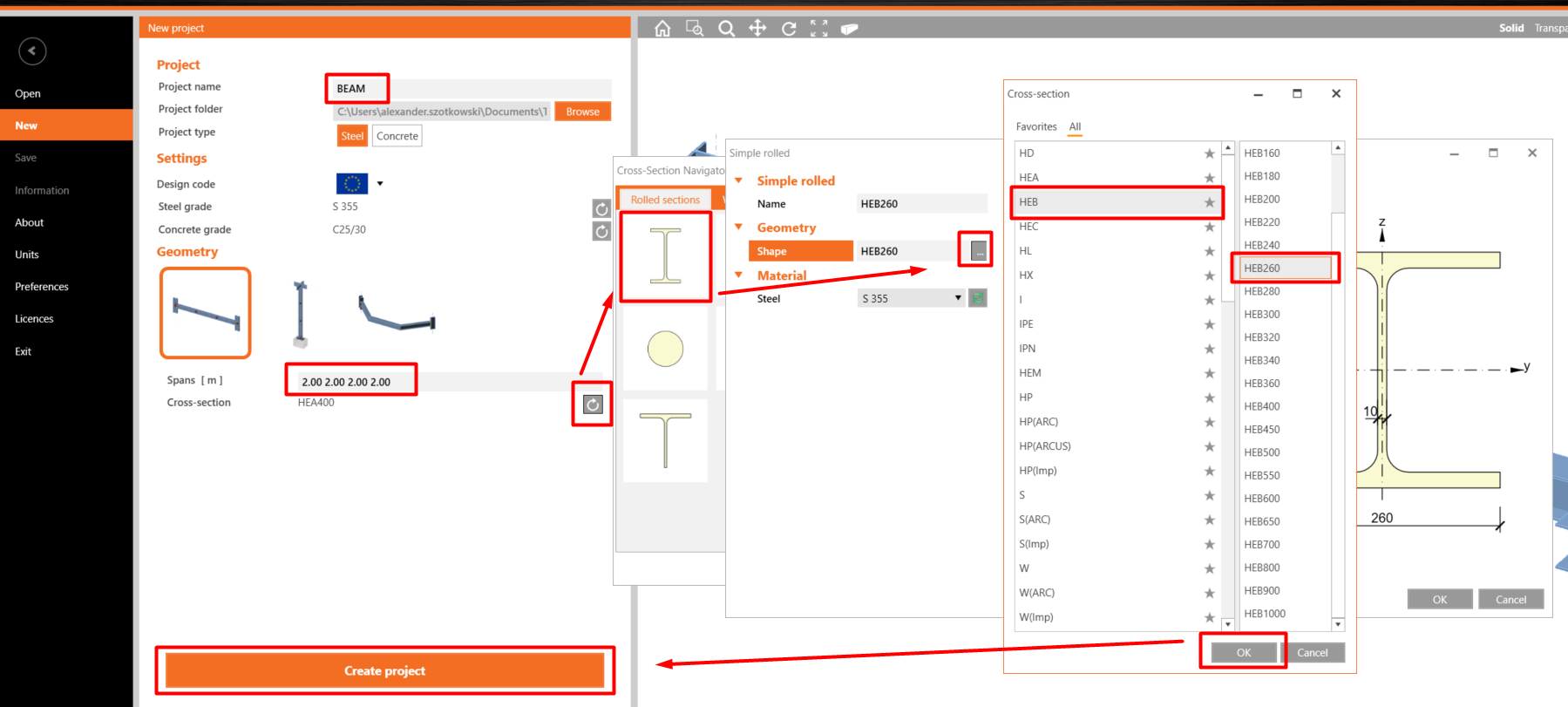 Vytvořte nový projekt - vyplňte jméno, nastavte rozpětí 4 x 2,0 m, vyberte průřez prutu HEB 260 a klikněte na Vytvořit projekt.