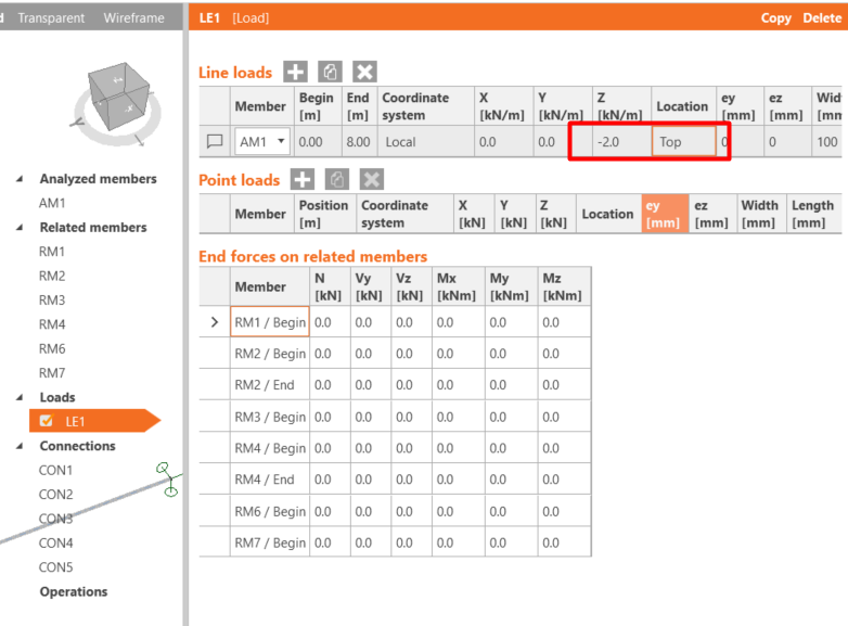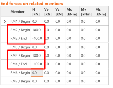 Posledním vstupem jsou síly působící na vertikální připojené prvky. Zadejte osové síly 100 KN a 180 KN na prvek RM2 a RM6 dle obrázku.