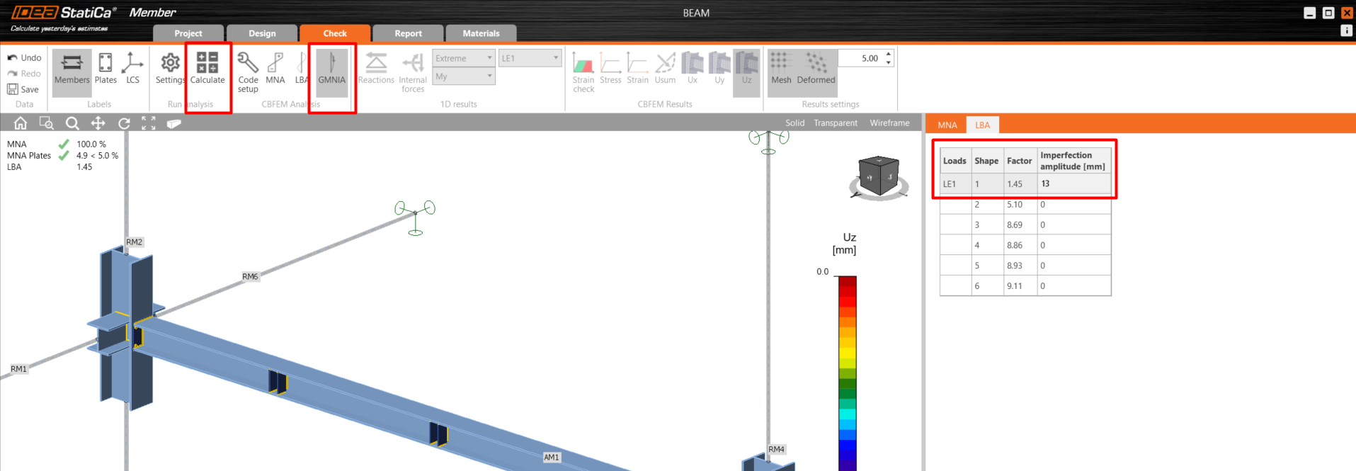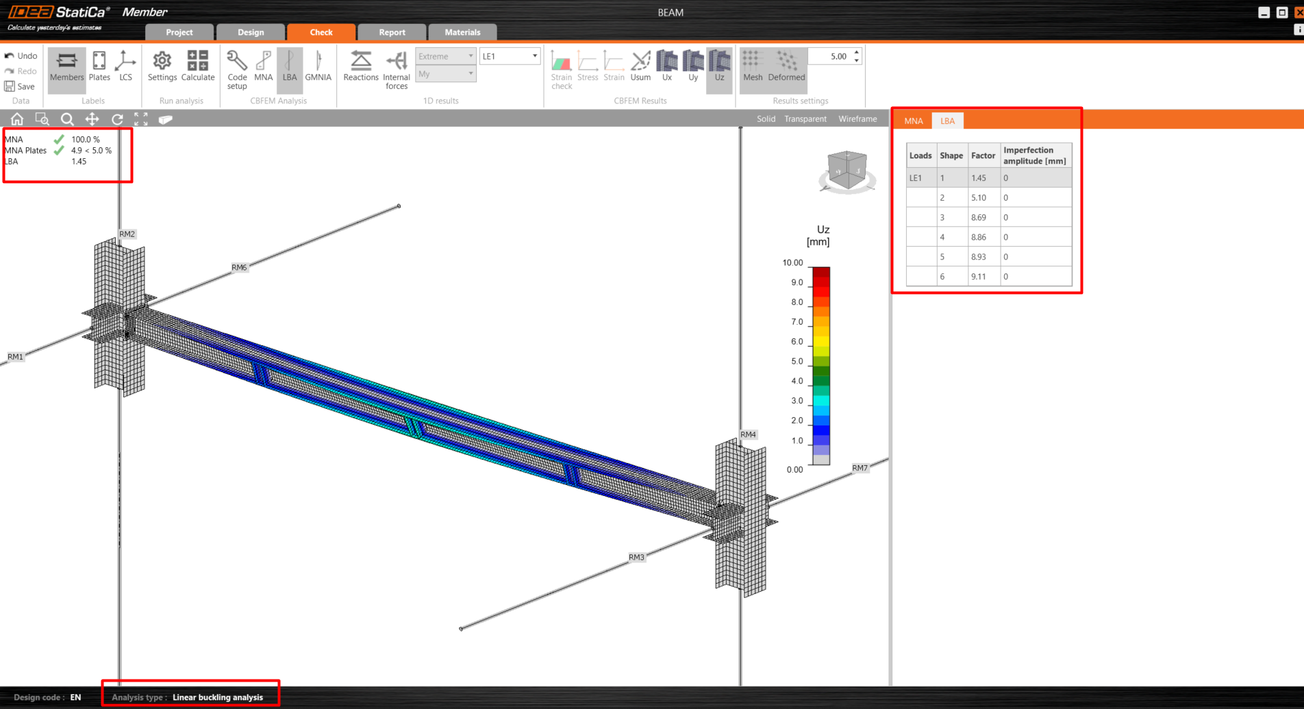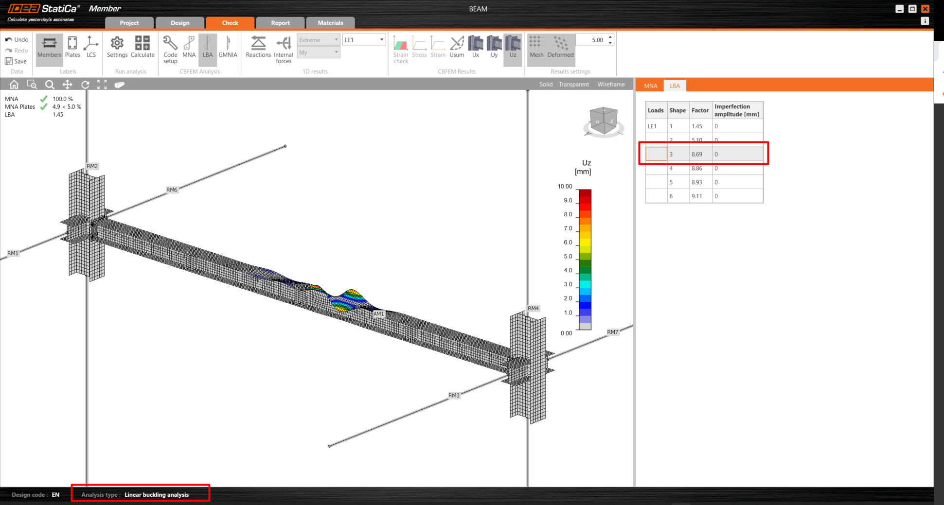 Lineární bifurkační analýzu lze provést výběrem LBA a kliknutím na Vypočítat.