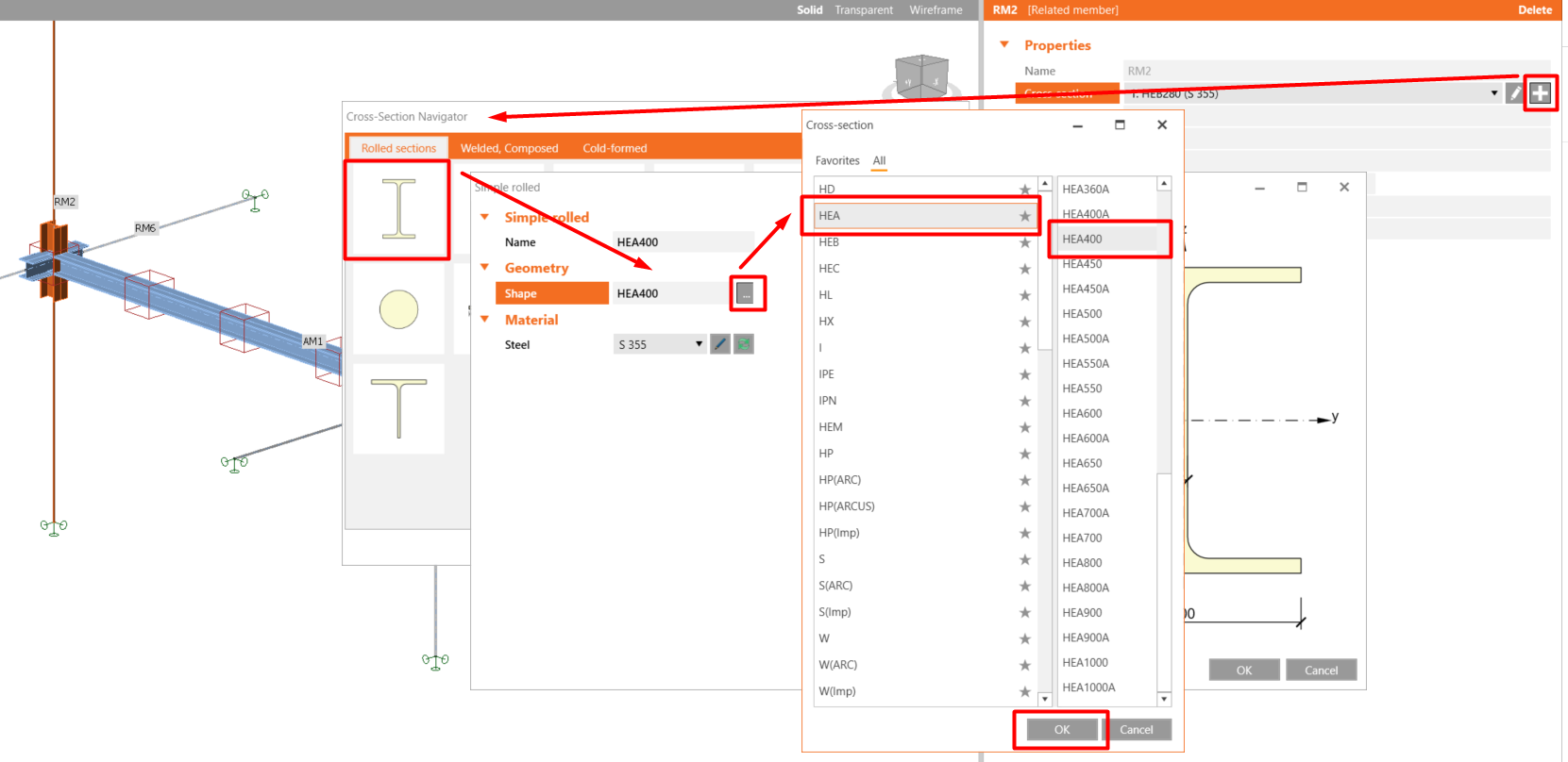 Nakonec ještě změňte všechny vertikální pruty (RM2, RM4) na HEA 400.