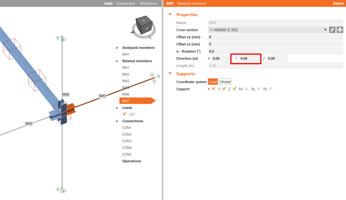 Přejděte na nově vytvořený Připojený prvek RM7 a změňte hodnotu u směru y na 4 m.