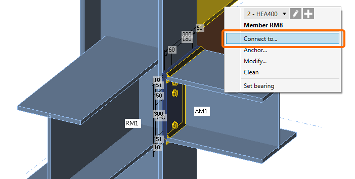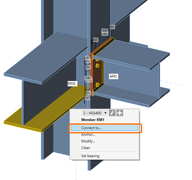 V novém okně IDEA StatiCa Connection klepněte pravým tlačítkem myši na prvek AM1, vyberte Připojit k ..