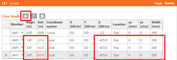 Nyní můžete přidat lokální síly působící na horní přírubě nosníku. Pro každé nové zatížení použijte tlačítko + a zadejte hodnoty dle obrázku. Předpokládáme, že roznášecí plocha je 0,2 x 0,2 m, takže u zatížení 425 kN / m je ekvivalent 85 KN.