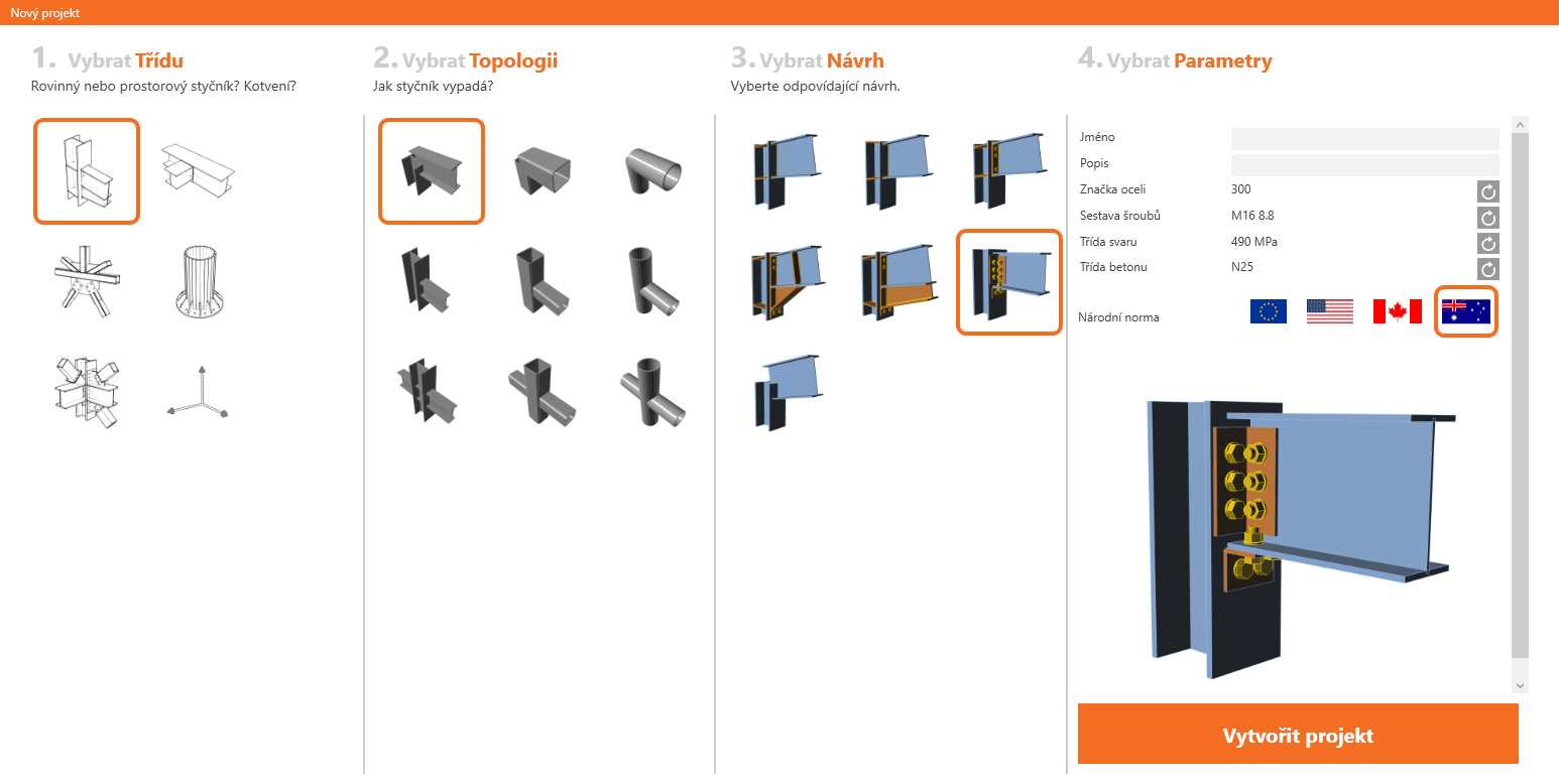 Nyní můžeme zvolit Australskou normu v parametrech průvodce tvorbou nového styčníku. Šablony pro třídy, topologie a návrhy jsou k dispozici v Australské normě - AU normě.
