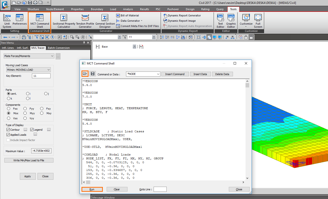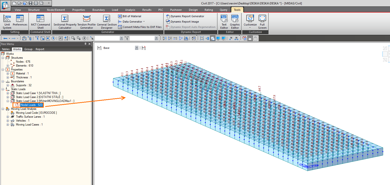 Výsledky zapíšete pomocí tzv. Moving load tracer, kde nastavíte element č. 11 a zapíšete  do mct souboru.