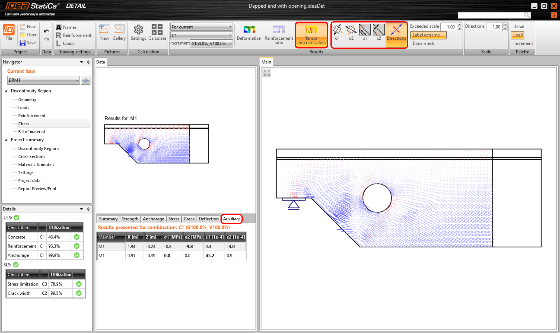 - Hlavní napětí v betonu σ1 a σ2. Všimněte si, že hlavní napětí σ2 je stejné napětí, které je uvedeno ve výsledcích Pevnosti.