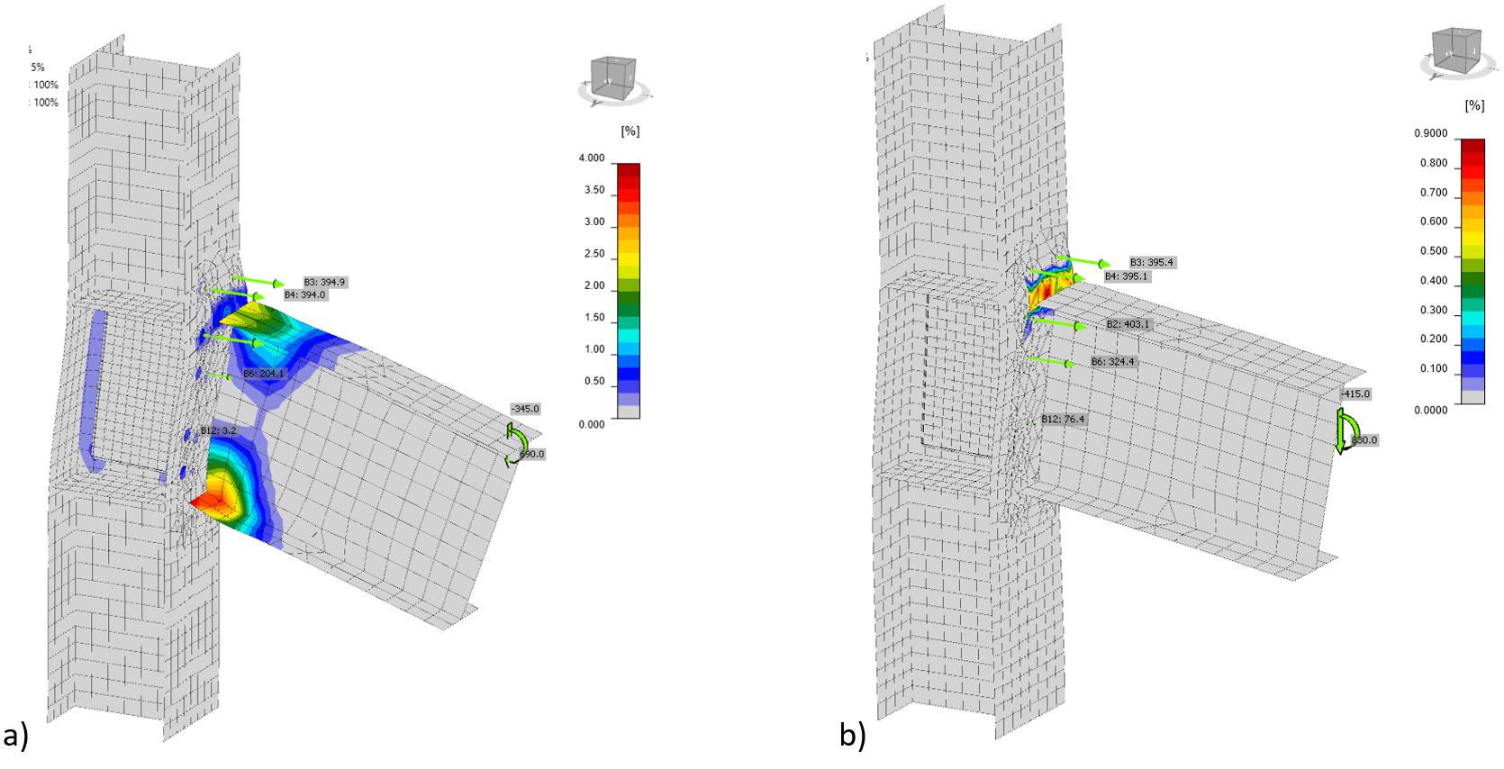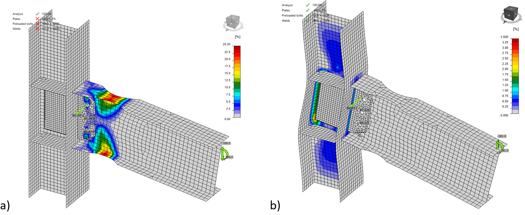 The governing failure mode by CBFEM is failure of bolts with yielding of plates, mainly end plate, column flange, and haunch. According to CBFEM, joints No. 4.2 and No. 264 are full-strength and joint No. 267 equal-strength. Column web panels are strong in all cases.