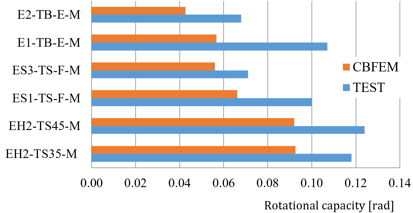 The CBFEM models of rigidity, load-bearing capacity, and deformation capacity of pre-qualified joints were validated by Montenegro (2017) on a set of experiments available from EQUALJOINT project. The examples of structural solutions are in Fig. 12.2.2. The results of validation of the failure mode are shown in Fig. 12.2.3. The summary of validation of resistance and deformation capacity for 15 % strain are shown in Figs 12.2.4 and 12.2.5.