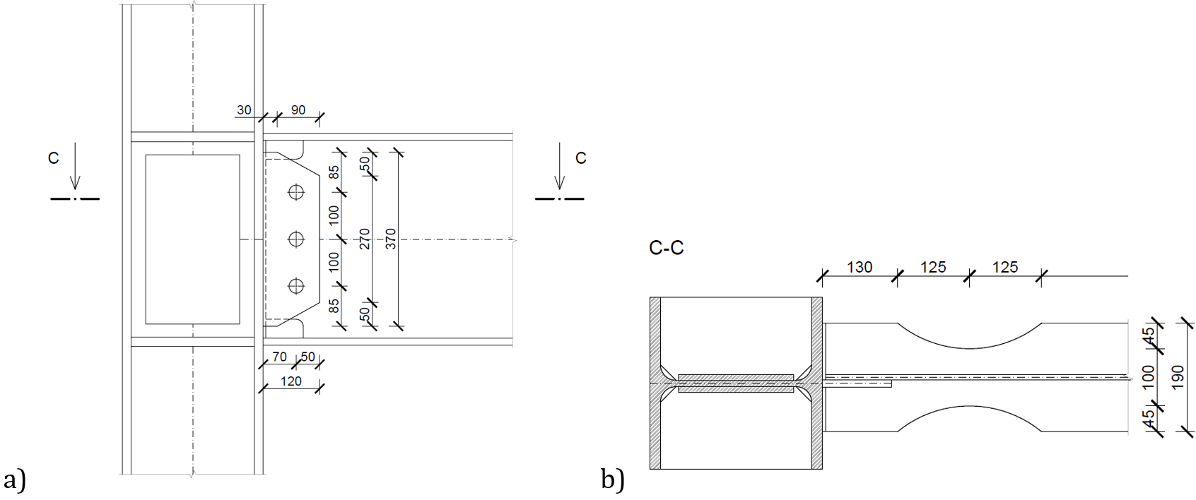 A prequalified welded reduced beam section joint according to ANSI/AISC 358-16 was selected for this study. The beam IPE 450 is connected to column HEB 300 by butt welds at flanges and fin plate 12 mm thick with three preloaded M30 10.9 bolts, with and without web doubler 10 mm thick; see Fig. 12.3.1. All used steel is grade S355.