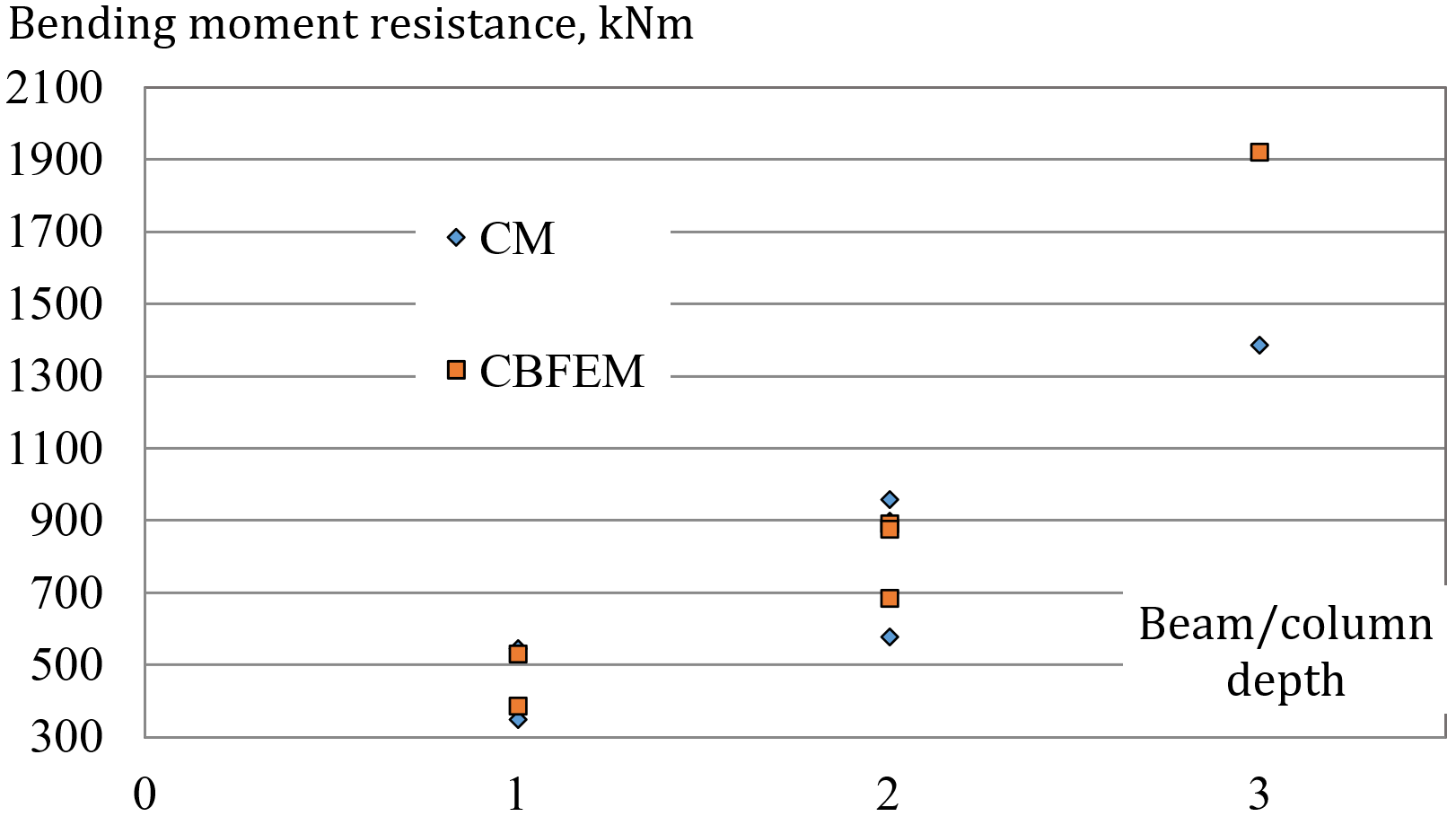 The CBFEM model was verified to CM according to Ch. 6 in EN 1993-1-8:2006. The selection of results is presented in Tab.12.2.1 and Fig 12.2.6. The results show the loss of accuracy of CM for larger joints, where the rough assumption of lever arm is guiding the accuracy.