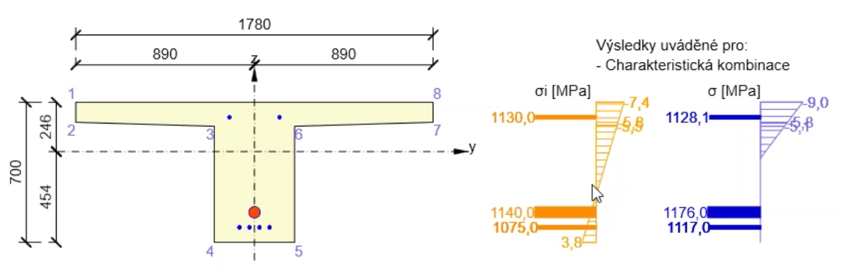 Napětí mezi programem Midas Civil a IDEA StatiCa je shodné na úrovni tzv. „počátečních“ účinků. Midas po celou dobu výpočtu až po výsledky uvažuje beton bez porušení trhlinami. IDEA StatiCa uvažuje i stav s trhlinami, pokud se překročí na tažených vláknech pevnost betonu v tahu. Celkové výsledky tedy budou zahrnovat i vliv redistribuce účinků po průřezu z důvodu vzniku trhlin. Dalším důvodem rozdílu může být uvažování součinitelů rsup a rinf pro předpětí a nelineární výpočet napětí v programu IDEA.