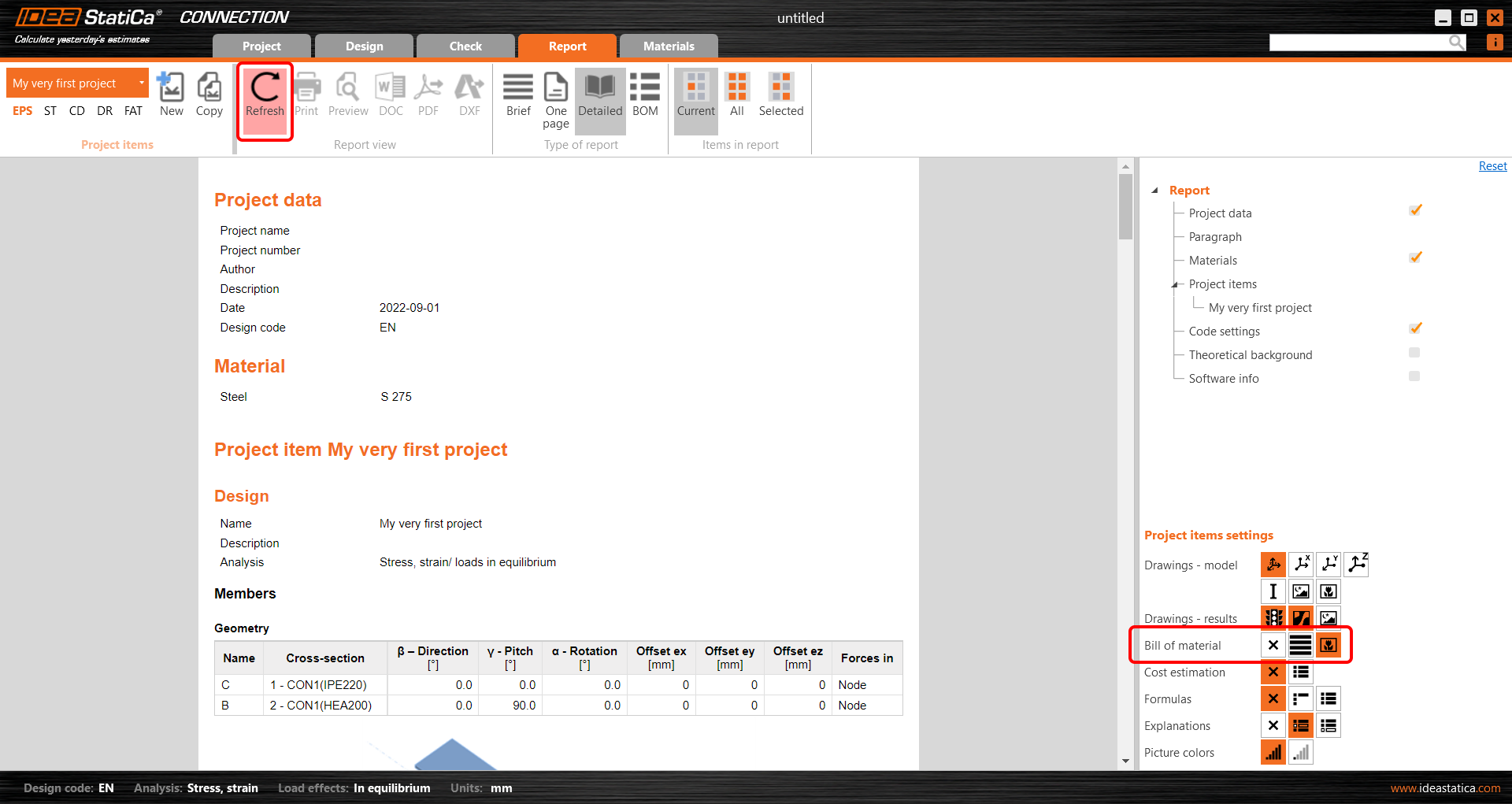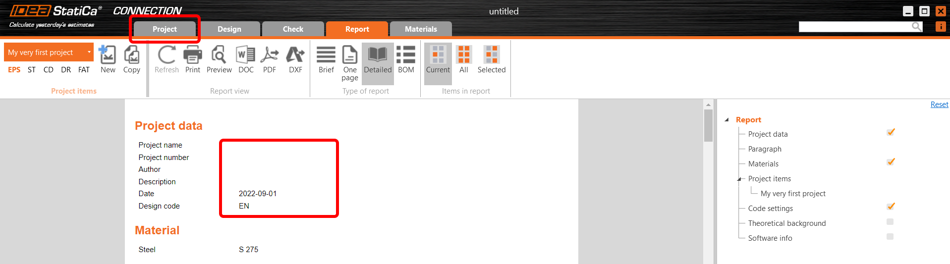 V části Parametry můžete svůj projekt pojmenovat a nastavit výchozí materiál (použijte ocel S275) a národní normu. Materiál můžete kdykoli změnit (nebo přidat jiný), nicméně normu pro posudky lze zvolit pouze v tomto prvním kroku. Vyberte Eurokód (EN).