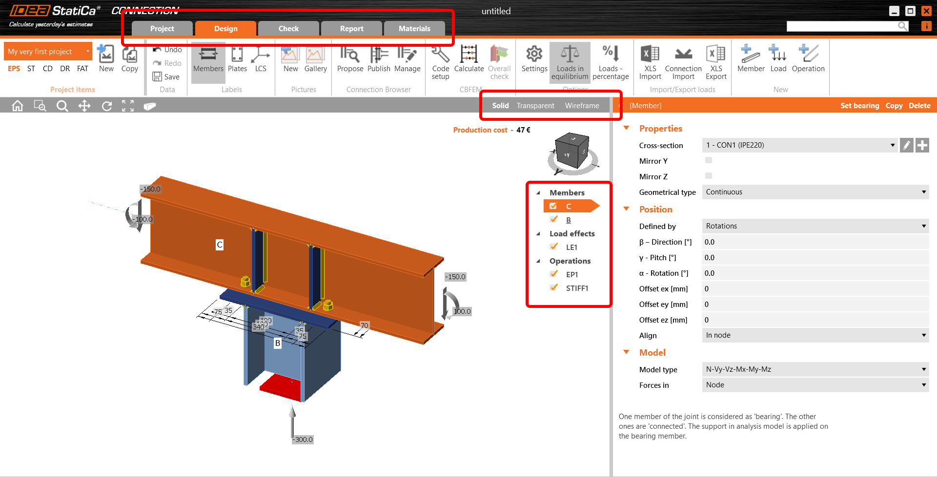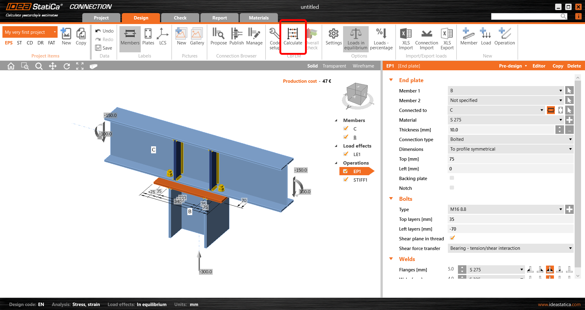 Ve třetí části stromu jsou definovány výrobní operace. Zvolený styčník obsahuje operaci čelní deska EP1 a operaci STIFF1 definující výztuhy na nosníku C. Opět můžete změnit libovolný parametr u všech operací nebo odstranit/přidat další.