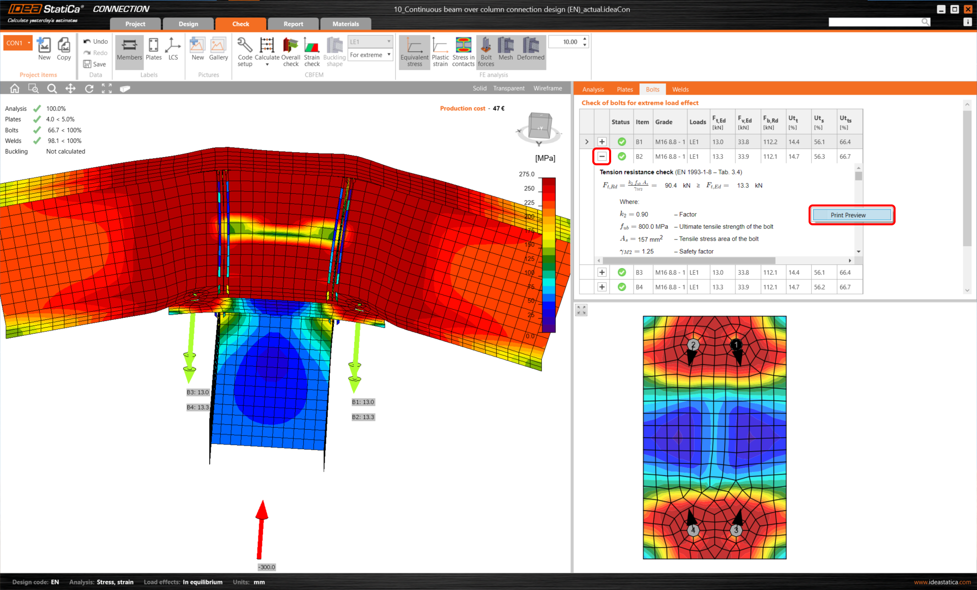 Ihned vidíte celkové výsledky zobrazující úroveň využití únosnosti jednotlivých komponent (šedá pro využití pod 60 %, zelená pro 60 - 95 %, oranžová pro 95 - 100 % a červená pro využití nad 100 %, tj. pro selhávající komponenty).