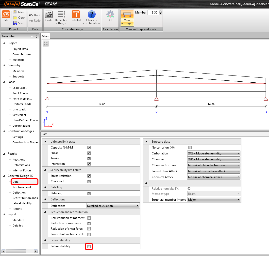 Nastavení posudků, které budou pro MSÚ a MSP vykonány, najdete v položce Posouzení betonu 1D – Data v levém stromu. Standardně jsou všechny posudky zapnuté. Vypněte posudek pouze pro Příčnou stabilitu, která je zajištěna.