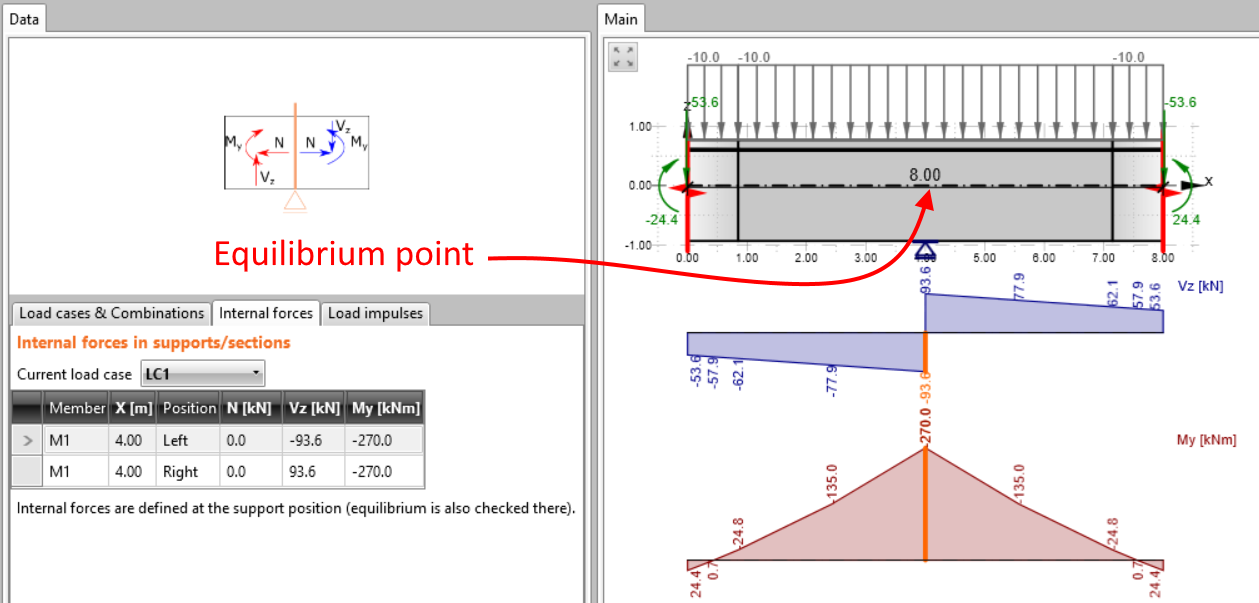 U tohoto modelu je rovnovážný bod umístěn nad podporou na okraji nosníku. Pro dosažení rovnováhy je třeba definovat zatížení jako v globálním modelu a hodnoty vnitřních sil. V tomto konkrétním případě jsou vnitřní síly, které je třeba vyplnit, ve skutečnosti reakce v podpoře převzaté z globálního modelu a nastavené jako svislá smyková síla. Správnost výsledků zkontrolujeme na diagramu vnitřních sil zobrazeném v hlavním grafickém okně aplikace. Program automaticky počítá hodnoty vnitřních sil k oříznutému konci nosníku, takže nakonec byste měli vidět stejné výsledky přesně pro toto místo jako v globálním modelu.