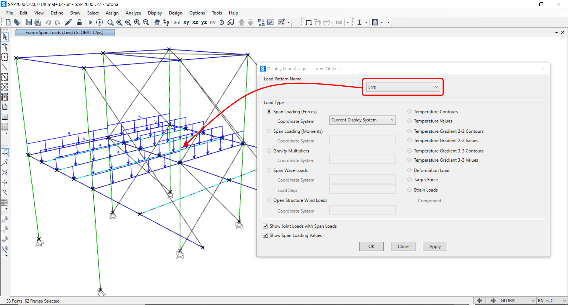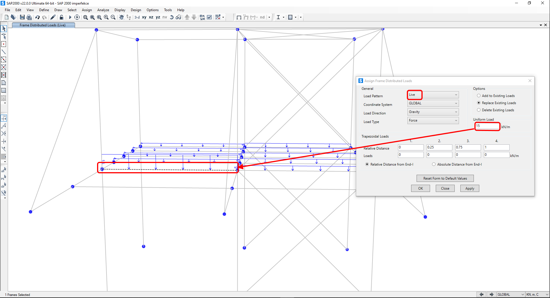 You pass-through the ribbon items Assign - Frame loads - Distributed and finally is revealed the relevant tab. Select the load case Live and indicate the member where will be adjusted the existing line load for the new one with value 15 kN/m.