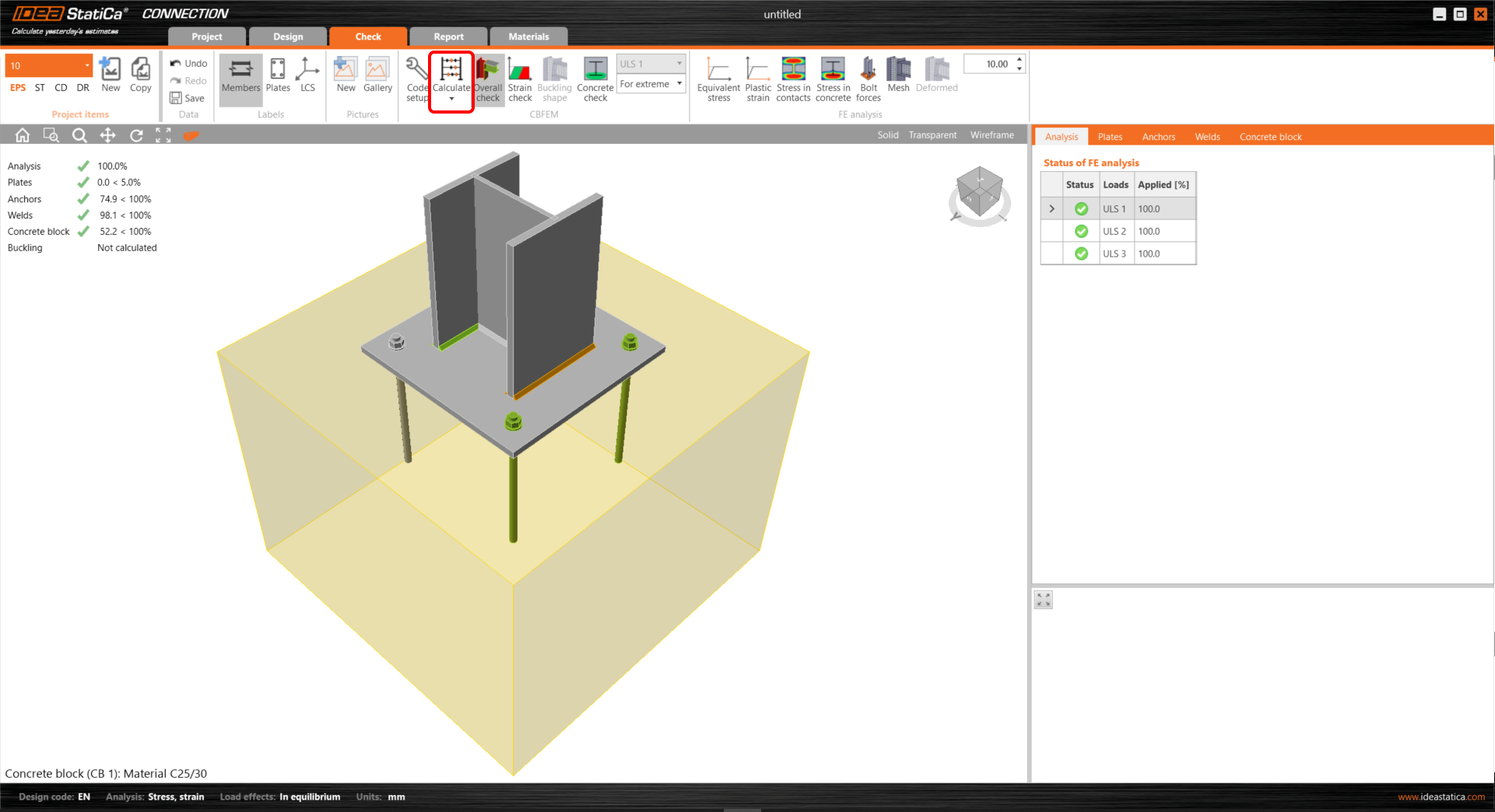 Nonlinear analysis is started by icon Calculate from the top ribbon. The analysis model is automatically generated, the calculation is performed and you can check results.