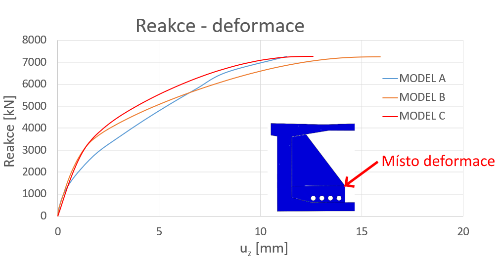 Komplexní chování modelu je prokázáno křivkou závislosti reakce v podpoře na svislém vektoru deformace. V modelu se odečítala deformace v oblasti napojení deviátoru na ztužující stěnu. Toto místo není zatíženo okrajovou podmínkou nebo vazbou a nedochází ke zkreslení. Rozdíly mezi komplexními Modely B a C a zjednodušeným Modelem A jsou způsobeny uvažováním tahové návrhové pevnosti betonu. Model A má počáteční stav, ve kterém není uvažována pevnost betonu v tahu. Tahové ztužení je přeneseno na model výztuže. V modelu B a C, je uvažováno s návrhovou pevnosti 1.6 MPa dle Thorenfeldt [4], což je o 0.3 MPa nižší hodnota než návrhová pevnost betonu v tahu dle EN 1992-1-1 [3].Výsledná reakce vykazuje při splnění podmínek mezního stavu únosnosti stejnou velikost.