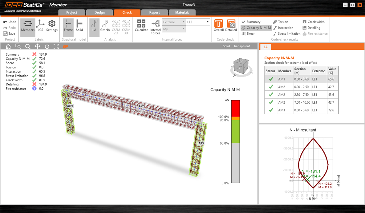- Aplikace obsahuje všechny posudky MSÚ a MSP pro rozhodující nosníky a rámy různých topologií, včetně posudků únosnosti, smyku, kroucení, interakce, omezení napětí a šířky trhlin.