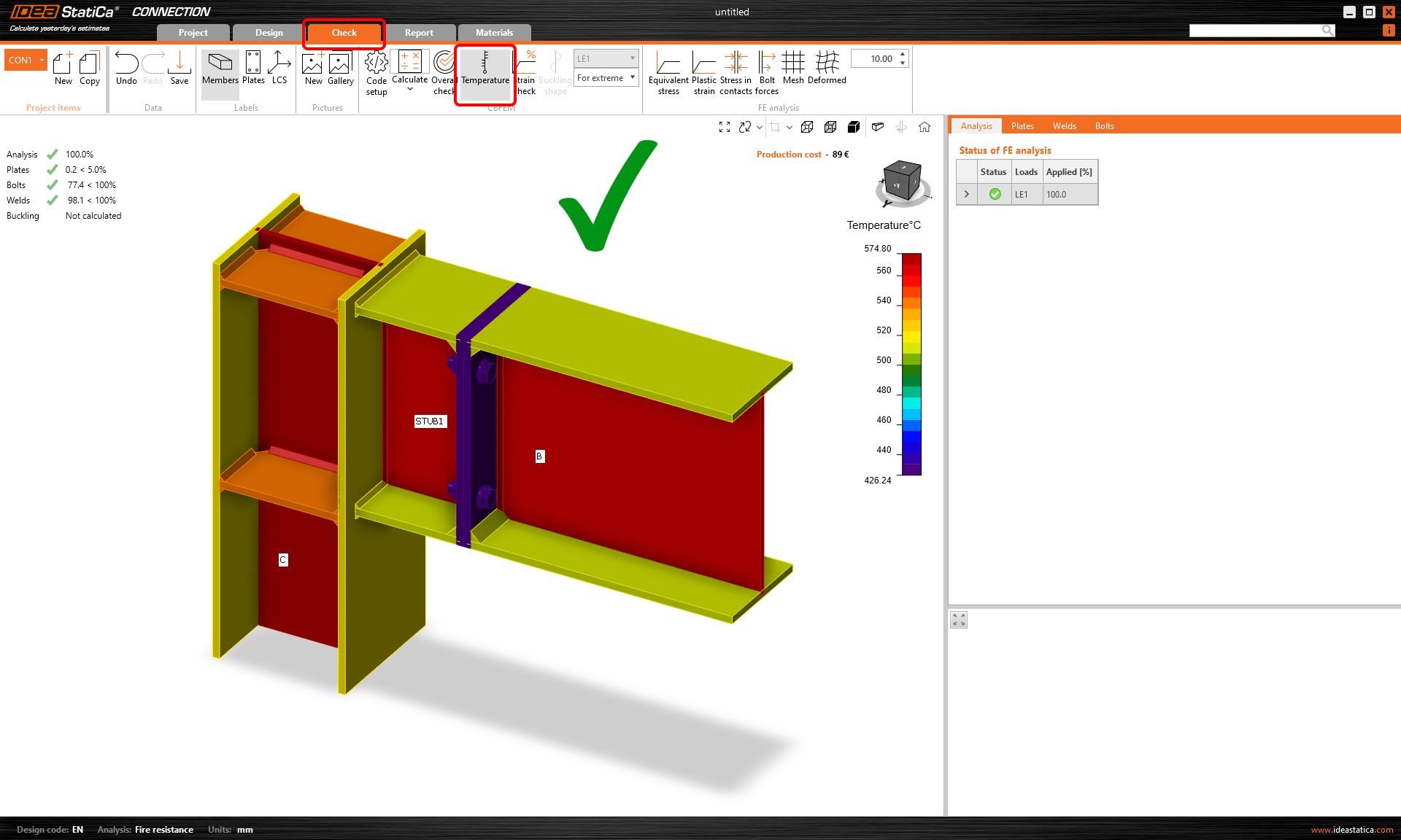 První skvělou novinkou je možnost posouzení požární odolnosti s využitím automaticky vypočítané teploty pro každý plech, šroub a svar v aplikaci IDEA StatiCa Connection.