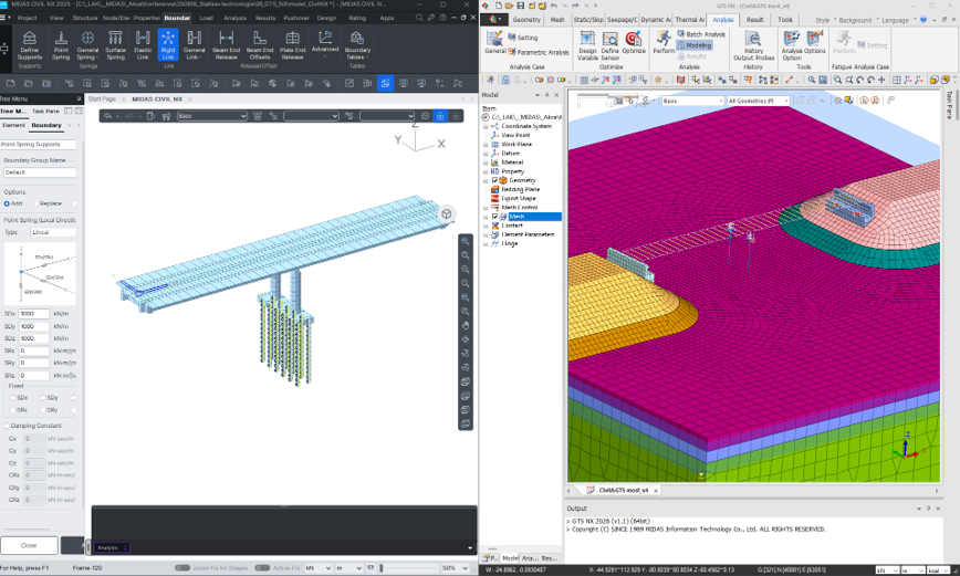 Na webináři budou vysvětleny a na praktických ukázkách ukázány dva přístupy - nepřímá (Substructure method) a přímá (direct method) metoda. V nepřímé metodě je interakce s podložím simulována soustavou pružin o dané tuhosti, kterou lze stanovit různými metodami a přístupy (nejčastějí známý parametr kh). Pomocí propojení mezi výpočetními softwary Civil NX a GTS NX lze tuhosti pružin získat iterací pomocí analýzy podloží metodou MKP. Metoda je hojně využívaná v běžné inženýrské praxi při analýze mostních konstrukcí.
