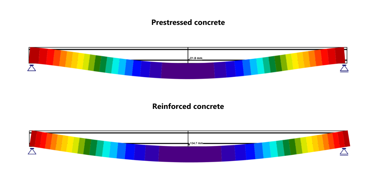 Die Rissbildung erfolgt daher im Vergleich zu Stahlbeton deutlich später. Außerdem ist die Rissentwicklung bei gleicher Belastung und bei kleineren Rissbreiten in Spannbeton langsamer. Dies ist wegen der Korrosion der Bewehrung wichtig. Es hängt aber auch mit der Steifigkeit der Struktur zusammen. Eine höhere Steifigkeit vorgespannter Strukturen führt zu kleineren Verformungen .